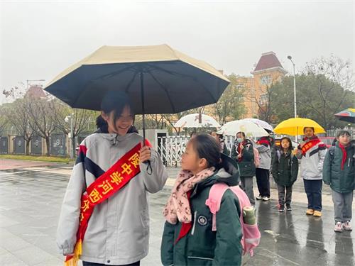 初中部的同学们将“学长制”与学雷锋行动充分结合,在风雨中,为小学部的弟弟妹妹们撑起雨伞,守护上学之路。