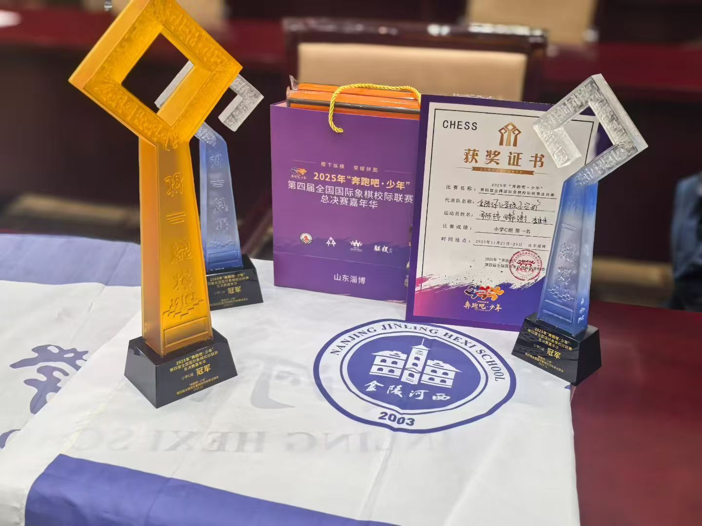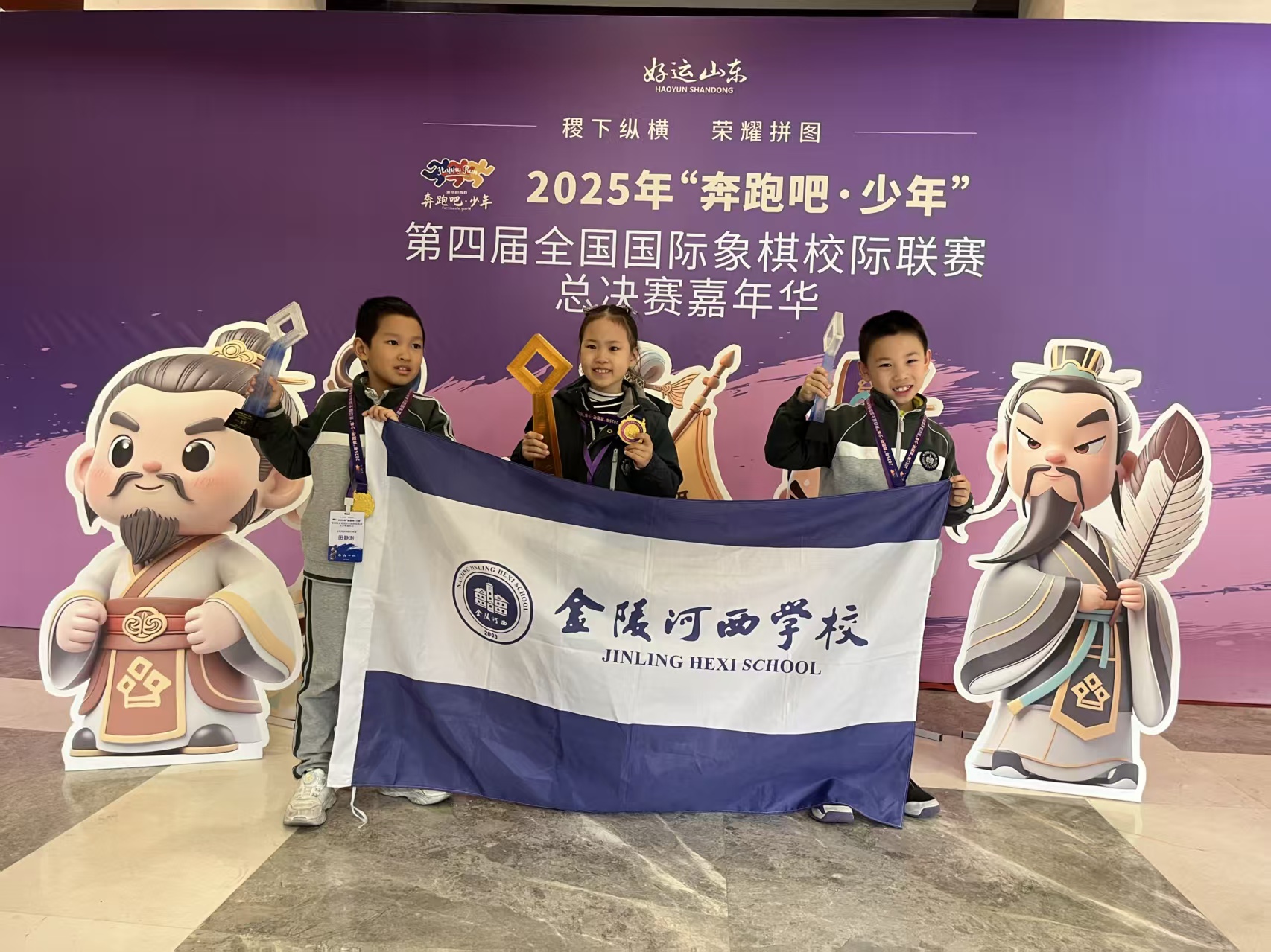 在刚刚落幕的2025年“奔跑吧·少年”第四届全国国际象棋校际联赛中,金陵河西小学部二5班季佳禾、周陈瑞、二9班田静澍三位同学组成代表队,沉着应战,最终勇夺全国冠军!这枚沉甸甸的奖牌,是智慧与毅力的完美结晶。