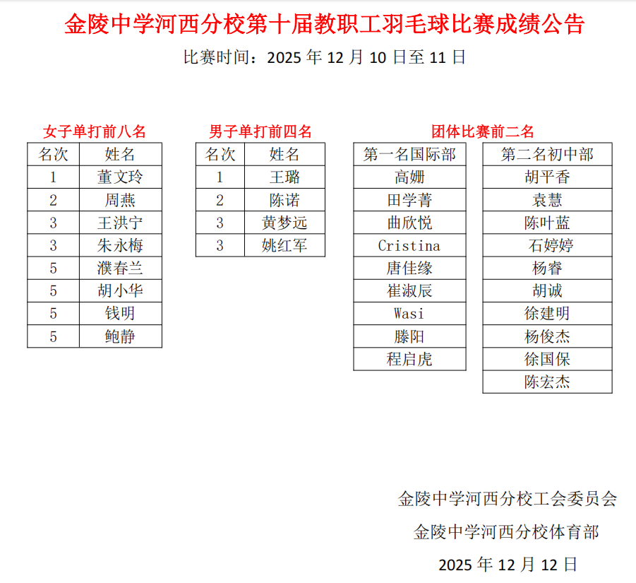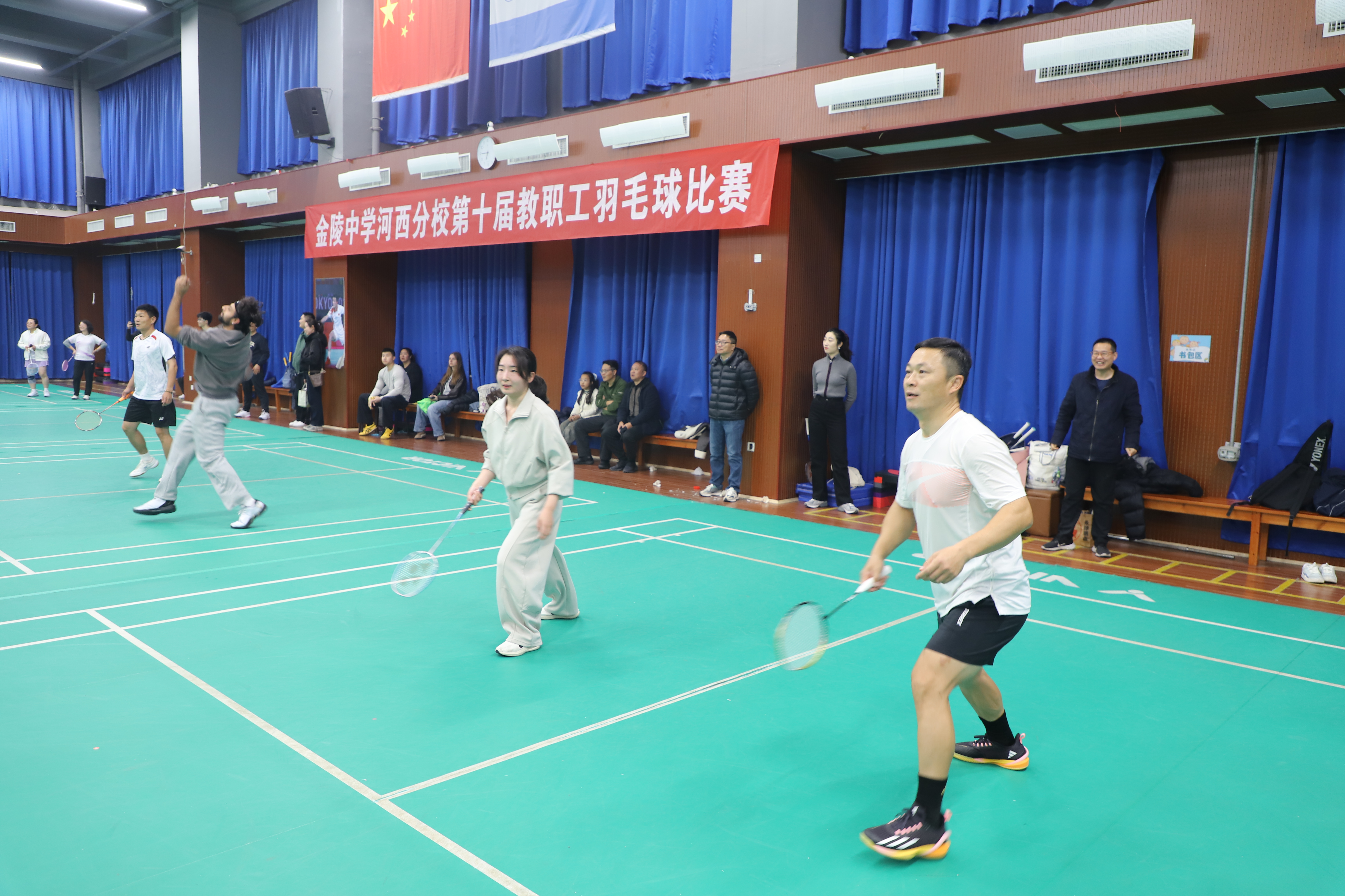 昨晚,校羽毛球馆灯火通明,喝彩如潮。随着最后一场比赛的终场哨响,我校第十届教职工羽毛球比赛——“羽”你同心悦河西,强身励志育桃李,在热烈氛围中圆满收官。