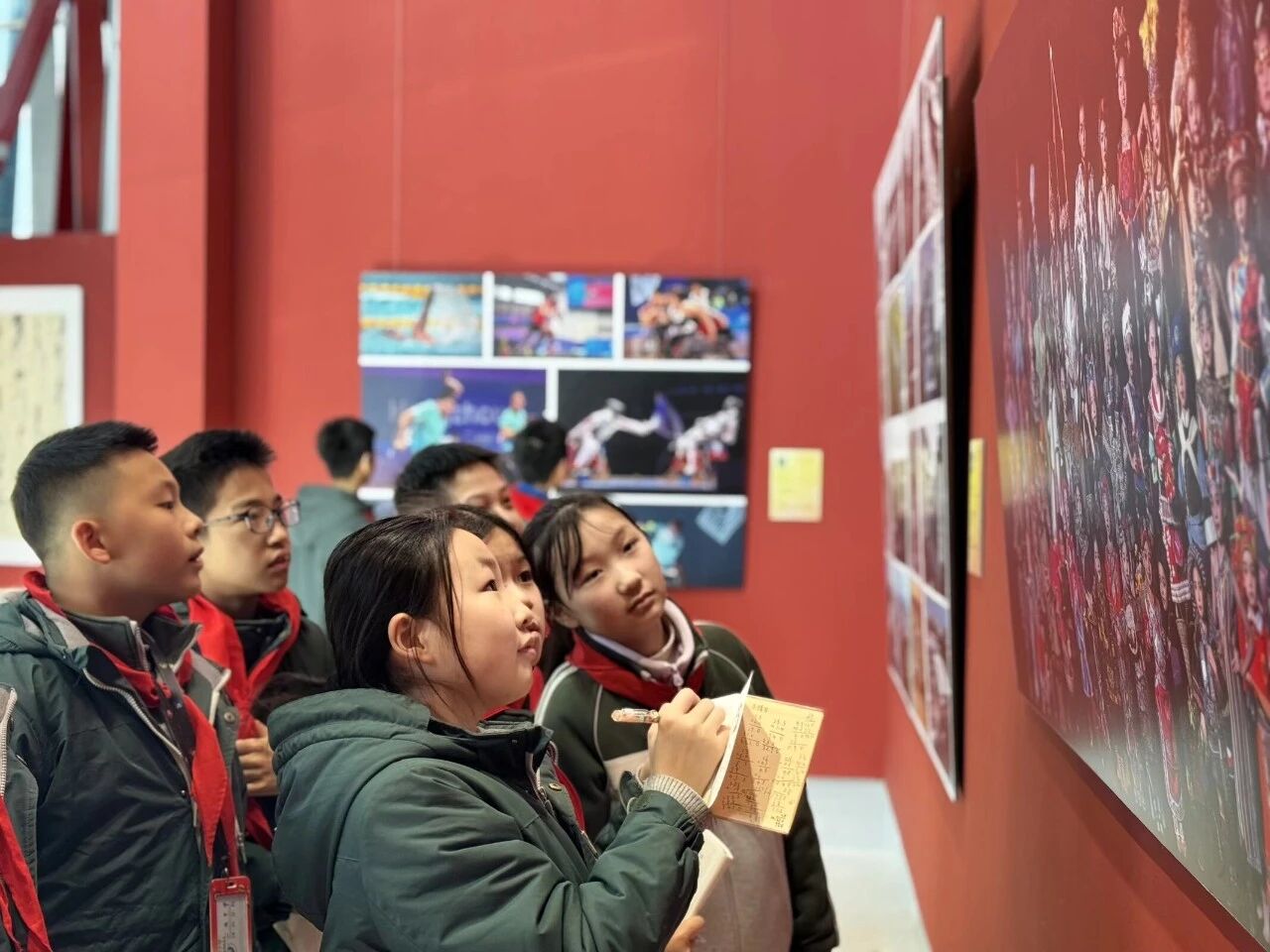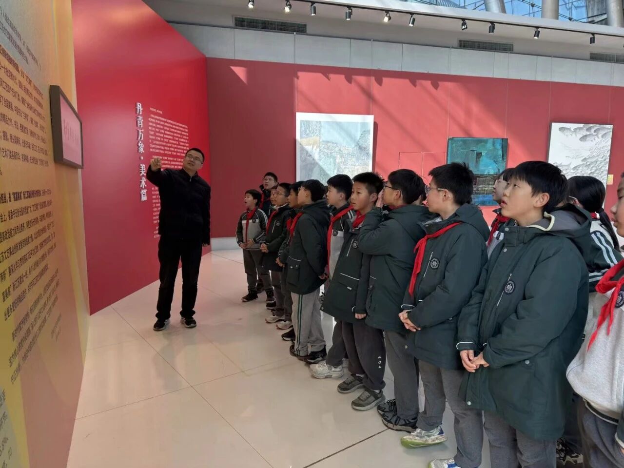 江苏省现代美术馆里,同学们依次参观了各类特色展览,近距离欣赏了书法、绘画、雕塑、装置艺术等多种形式的精品力作。同学们驻足凝视,认真聆听,小声交流,尝试理解作品的创作意图与表现手法,置身艺术殿堂,欣赏美、感受美,润泽心灵,拓宽视野。