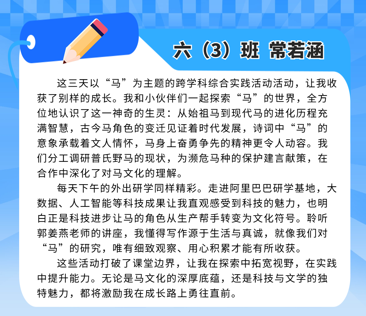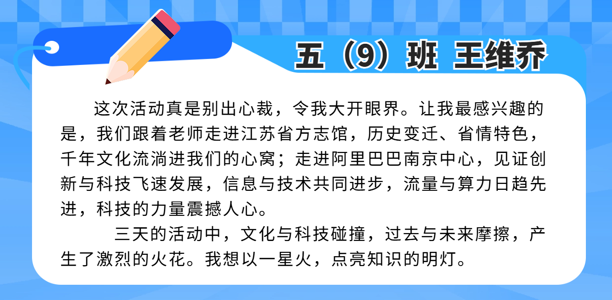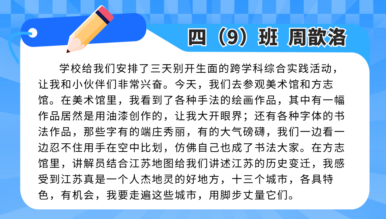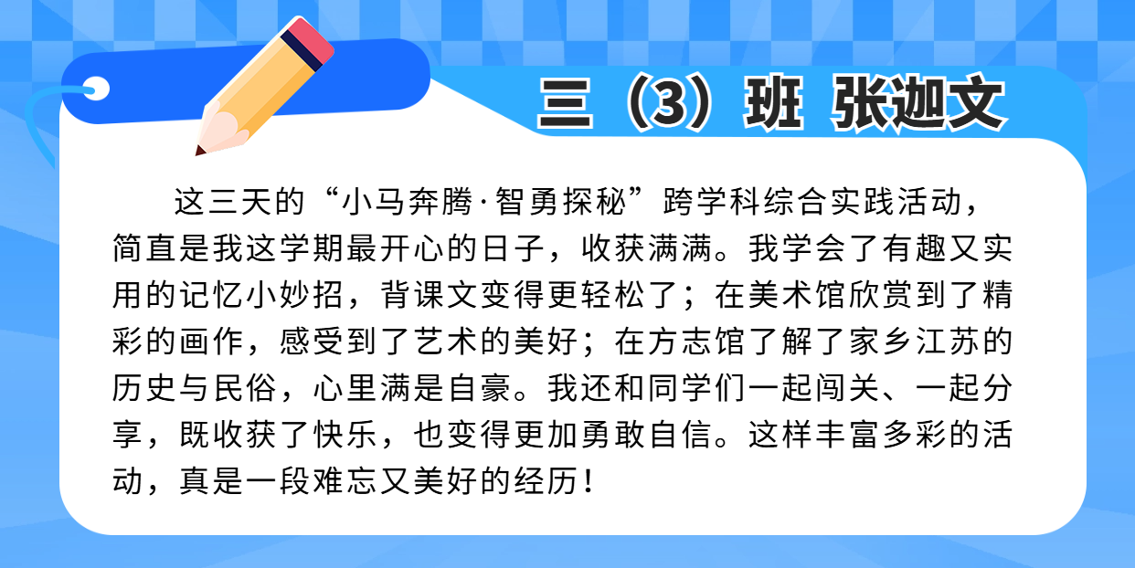 这场跨学科综合实践活动,融合语文的 “读”、数学的 “思”、英语的“说”,艺术的“审美”、体育的“活力”、科技的“魔力”……从教室到场馆,从书本到社会,可触摸、可探索、可表达,可亲可感,收获多多!