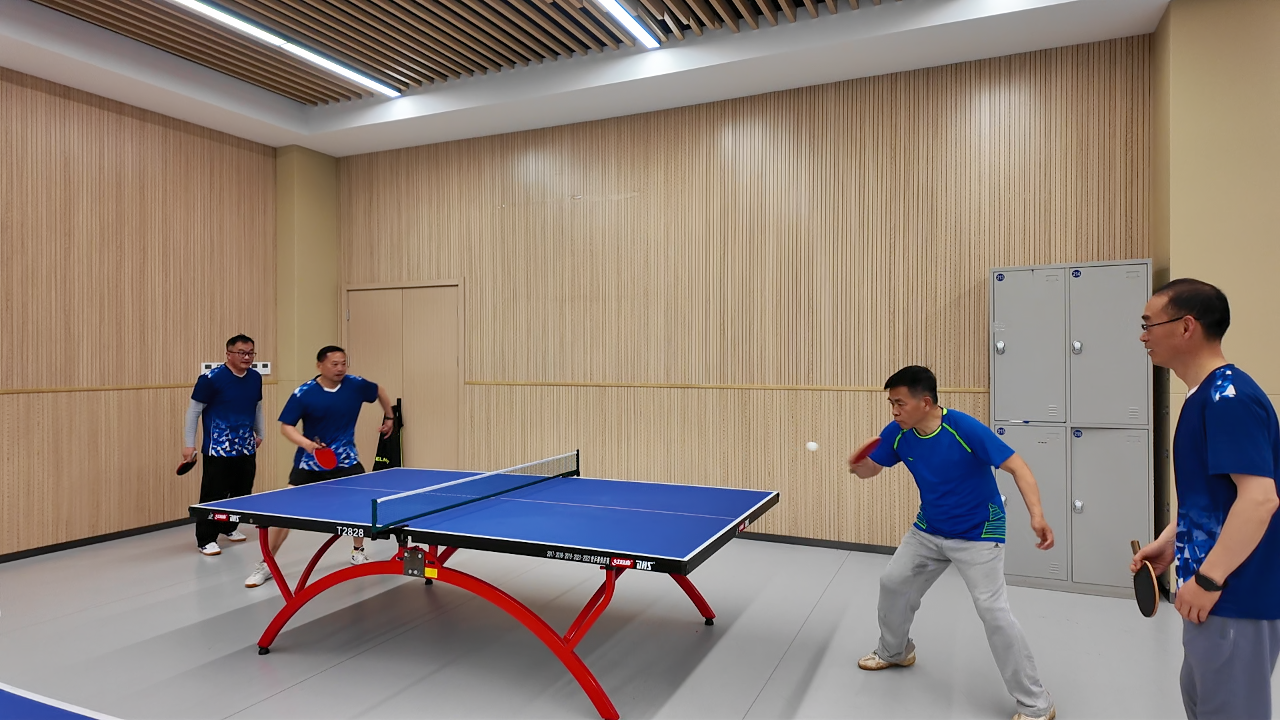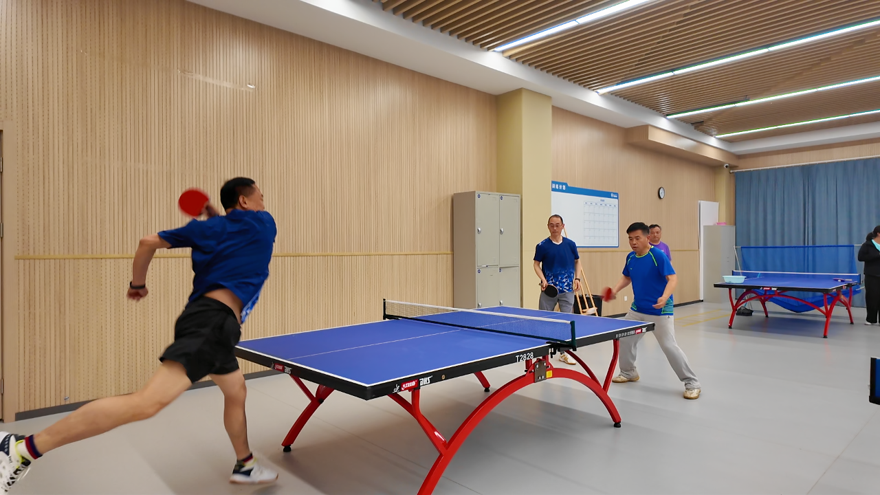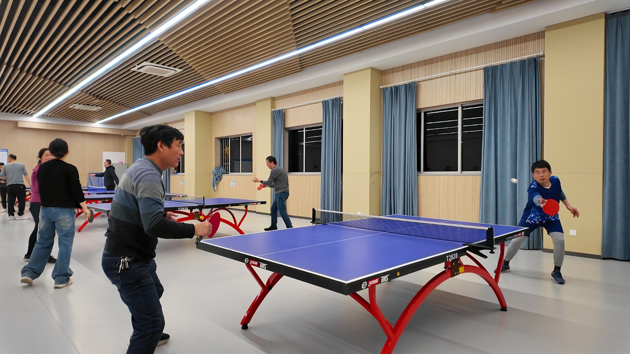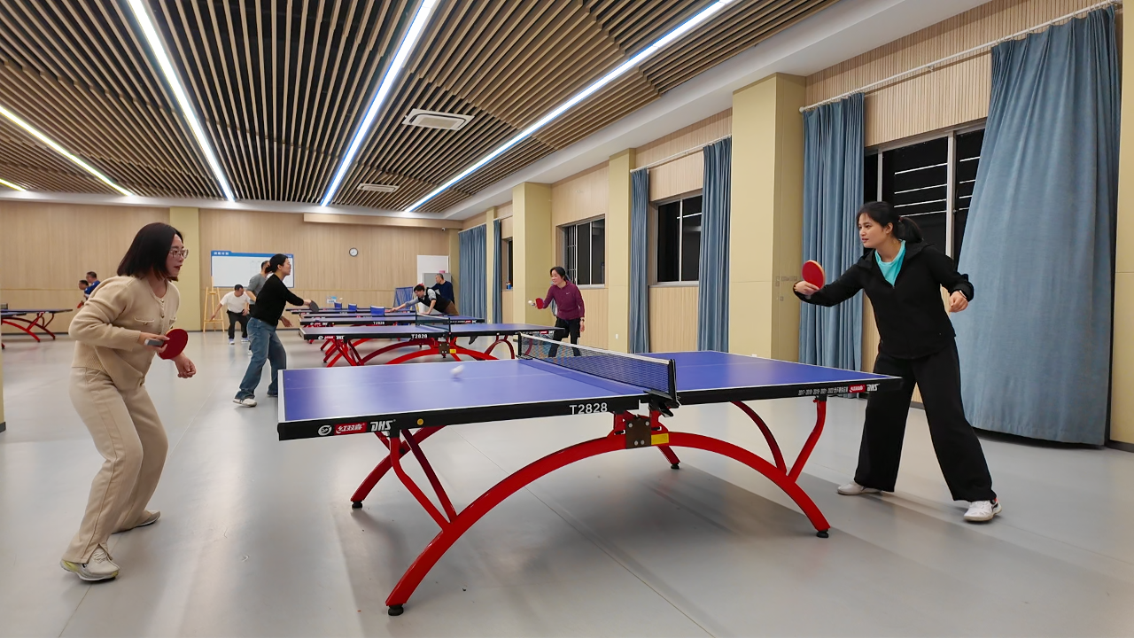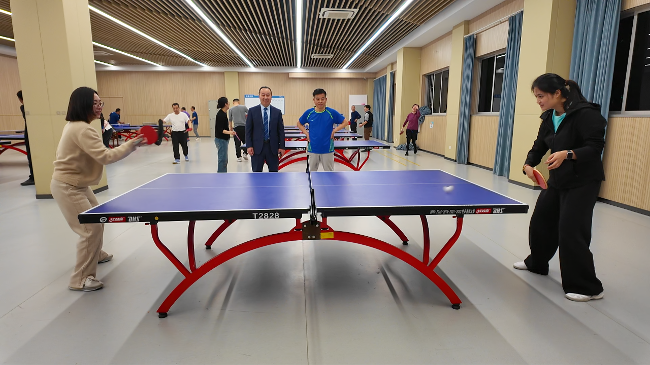 本学期的乒乓球社团启动仪式由工会程立主席主持。仪式结束后,球馆内顿时沸腾起来。馆内球桌全部满员,银球飞舞,喝彩声此起彼伏。单打区,攻防转换令人目不暇接——这边一记凌厉的扣杀直奔死角,那边一个轻巧的削球稳稳落台;你推挡如铜墙铁壁,我抽击似雷霆万钧。只见仇校长身姿矫健,眼神专注,正手拉球刚劲有力,反手推挡柔中带刚,一招一式颇有专业风范;双打区同样精彩纷呈,搭档间一个眼神、一个手势便心领神会,时而前后站位轮番进攻,时而左右穿插补位防守,默契十足。场边,暂时轮空的爱好者们也毫不闲着,或屏息凝视精彩对攻,或专业点评技术要领,不时爆发出阵阵喝彩与掌声。