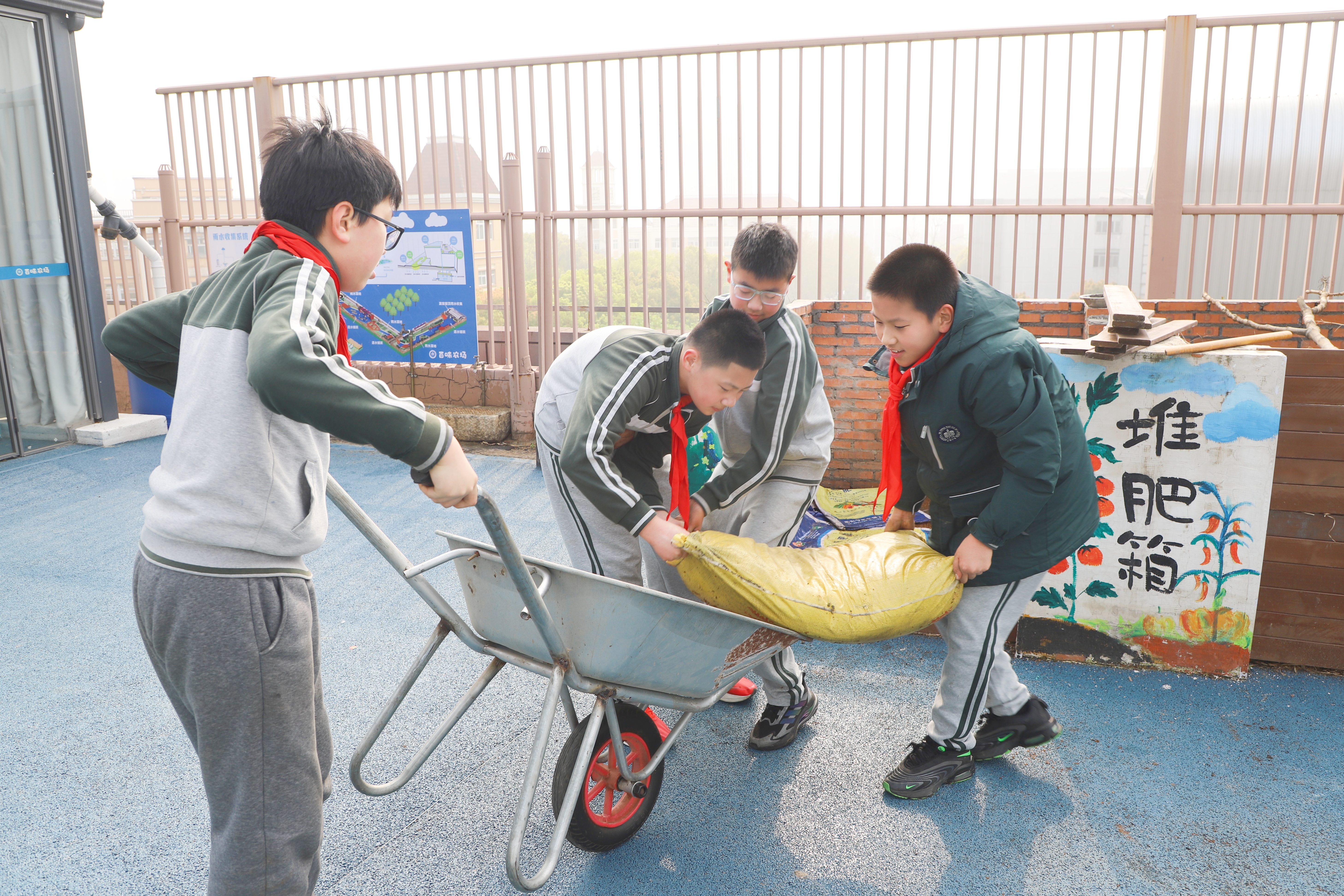 在春假里,“小小农夫”们挽起袖子,蹲在“百味农场”里忙活。挽起衣袖,给绿植细心浇水、施肥,弯腰清理豌豆苗间的杂草,亲手埋下芋头的种子。