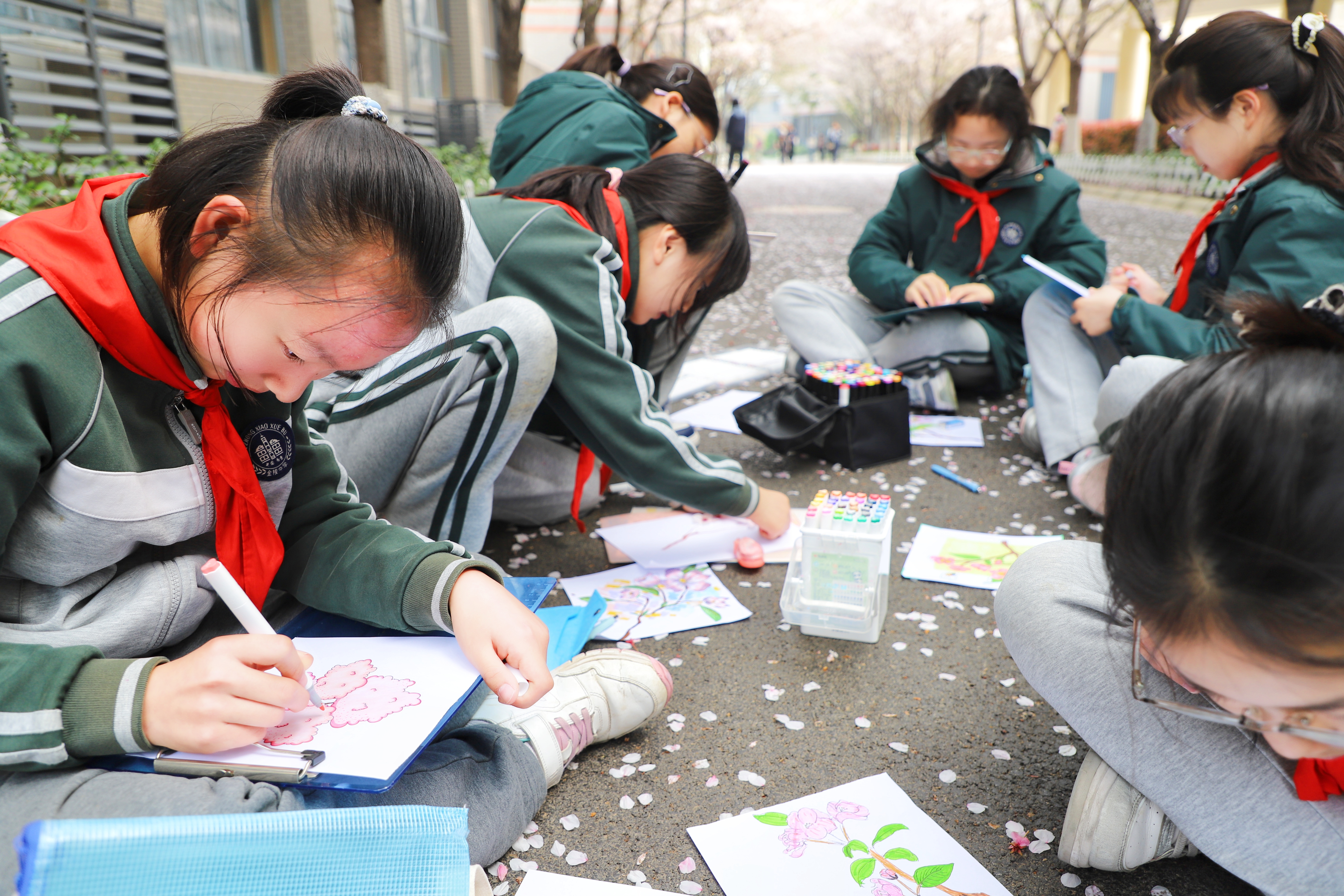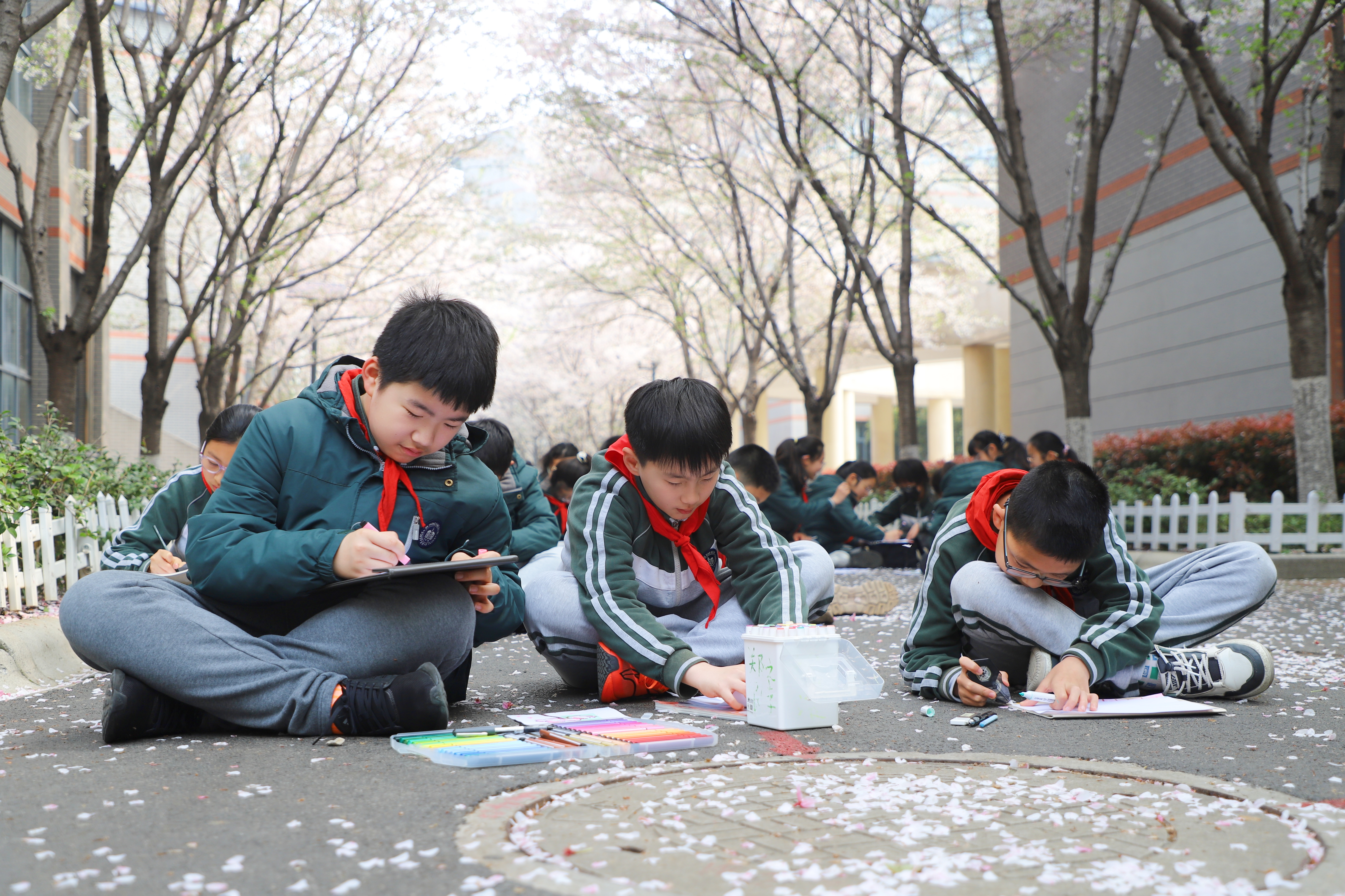 樱花大道上,粉白花瓣随风飘落,孩子们席地而坐,用画笔与春天对话。每一笔色彩都藏着对春天的感知,每一幅画作都承载着童真的想象,自然之美与艺术之美在画纸上交融。