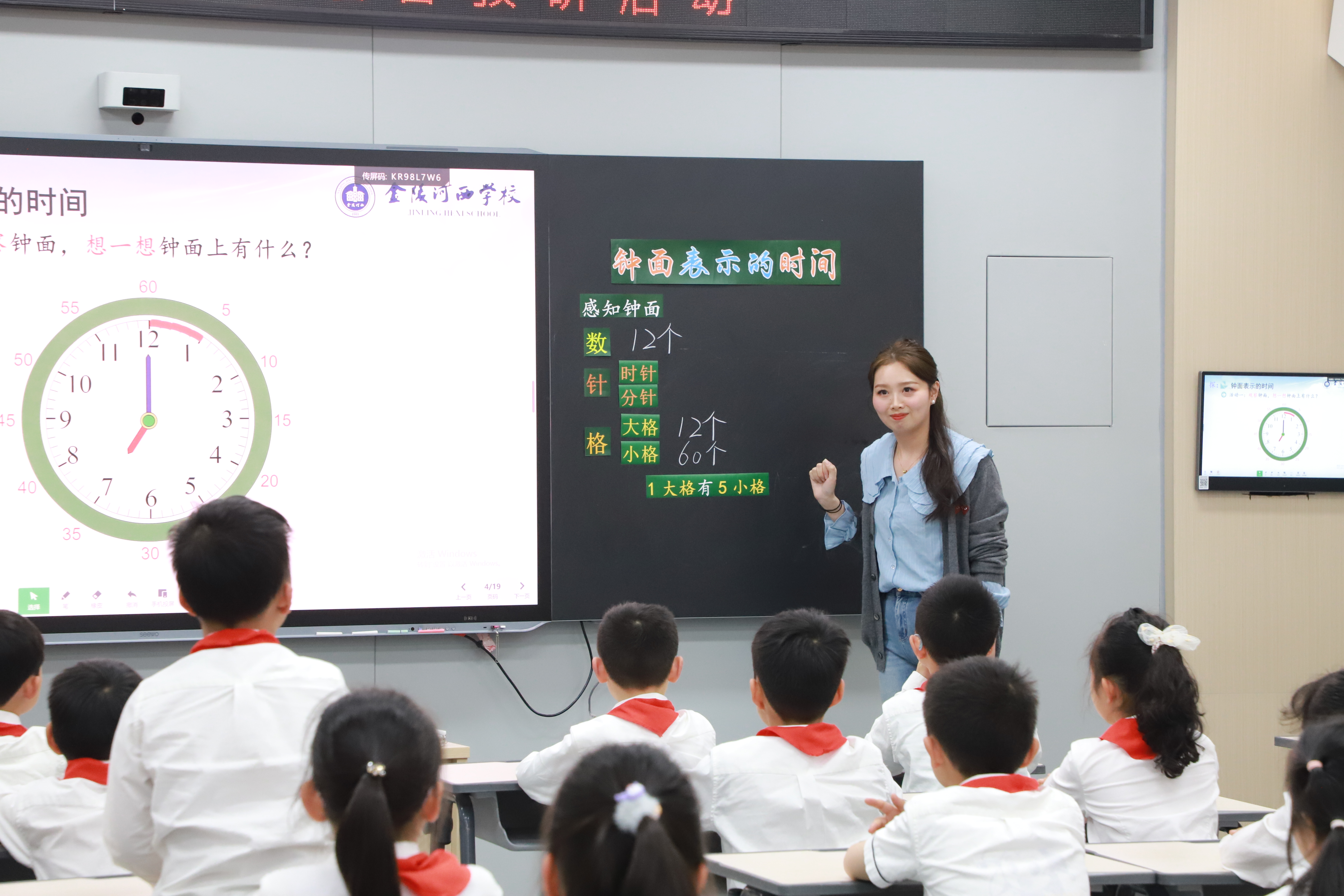 金陵河西学校小学部王胜男老师执教二年级《钟面表示的时刻》,通过动手拨钟、自主探究,认识时、分关系,在具体操作与合作表达中建立时间量感,渗透珍惜时间的教育。