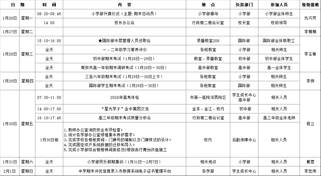 第二十二周工作安排(2026年1月26日—2月1日)
