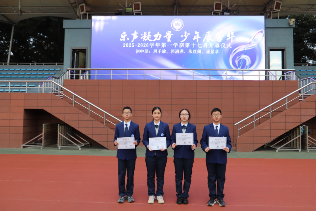 合(四位同学齐声,语气坚定又充满活力):让我们以乐为媒,以心相连,带着民乐给予的力量,践行 “诚真勤仁”,奔赴 “未来胜任”,不负韶华,未来可期!我们的发言完毕,谢谢大家!