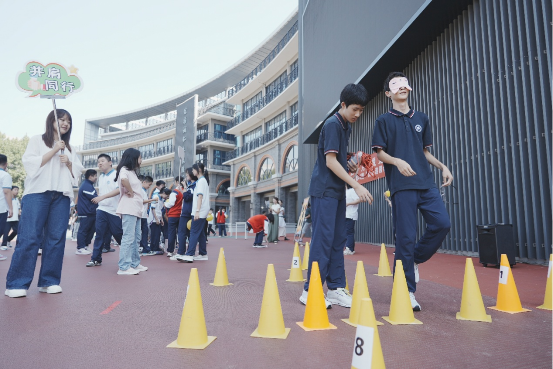 体验完“梦想气球”,同学们又被“并肩同行”游戏深深吸引。两两组队配合,戴着眼罩的同学完全依靠同伴的指挥,在障碍物之间穿梭,在体验中切地感受信任与协作的力量,现场到处都是欢声笑语和加油鼓劲的声音。