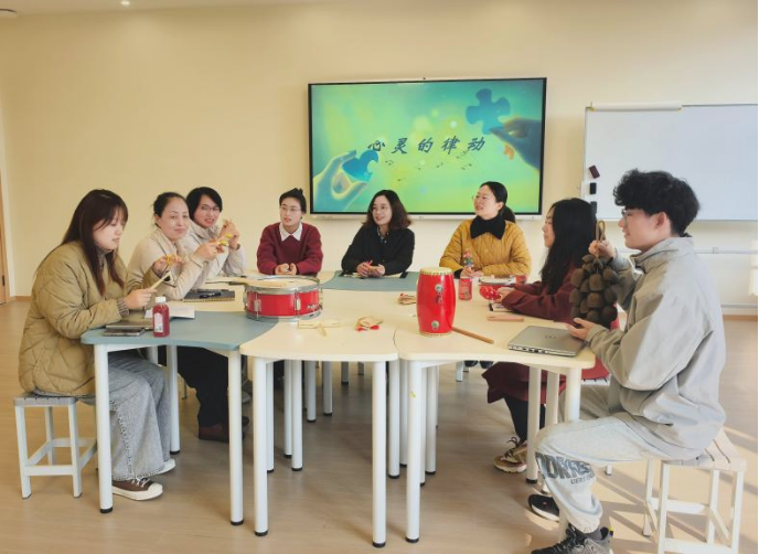 活动在轻柔的音乐疗愈中徐徐开启,老师们在自由即兴的旋律合奏中逐渐放松,用音符构建了一个安全、接纳的场域。随之而来的舞动疗愈环节,则引导老师们通过身体的自然律动,感受并表达内在自我,在无需言语的默契互动中,悄然建立起彼此支持的情感连接。