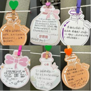 现场气氛活跃温馨,同学们根据兴趣自由穿梭于各个区域。在“解忧杂货区”,大家用多彩的emoji贴纸标记当下的情绪,在“心语回音”漂流瓶中写下悄悄话、小目标,让情绪被温柔安放。团体游戏区笑声不断:“元气作战”中,两人三足、四人五足齐心协力穿越障碍;“不倒森林”里,多人接力、默契配合,在协作中传递信任与支持。自我探索区则流淌着诗意与创意,同学们写下“爱你老己”三行诗,亲手制作专属优势勋章,在书写与创造中看见自己的光亮。