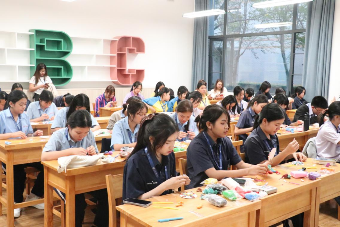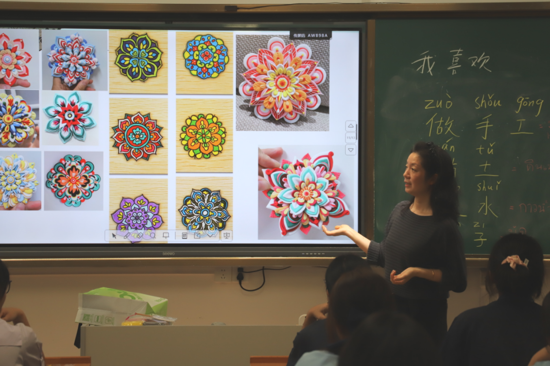 近日,来自泰国的四十名师生到访我校进行交流访学。为增进国际学生对中华优秀传统文化的了解与体验,我校初中部美术老师陈叶蓝为远道而来的客人们精心策划并主持了一场别开生面的中国传统文化体验课——敦煌主题黏土团扇制作。