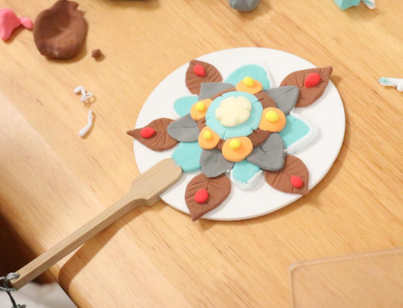 在陈老师的逐步指导下,四十位泰国学生热情投入创作。他们细心地将彩色黏土捏塑成敦煌壁画中飘逸的飞天、精美的花朵或灵动的纹饰,再精心布局、粘贴于素面团扇之上。指尖流转间,一把把独具匠心、色彩斑斓的黏土团扇作品陆续诞生,古老的敦煌艺术在异国学子的巧思妙手中焕发出新的活力。