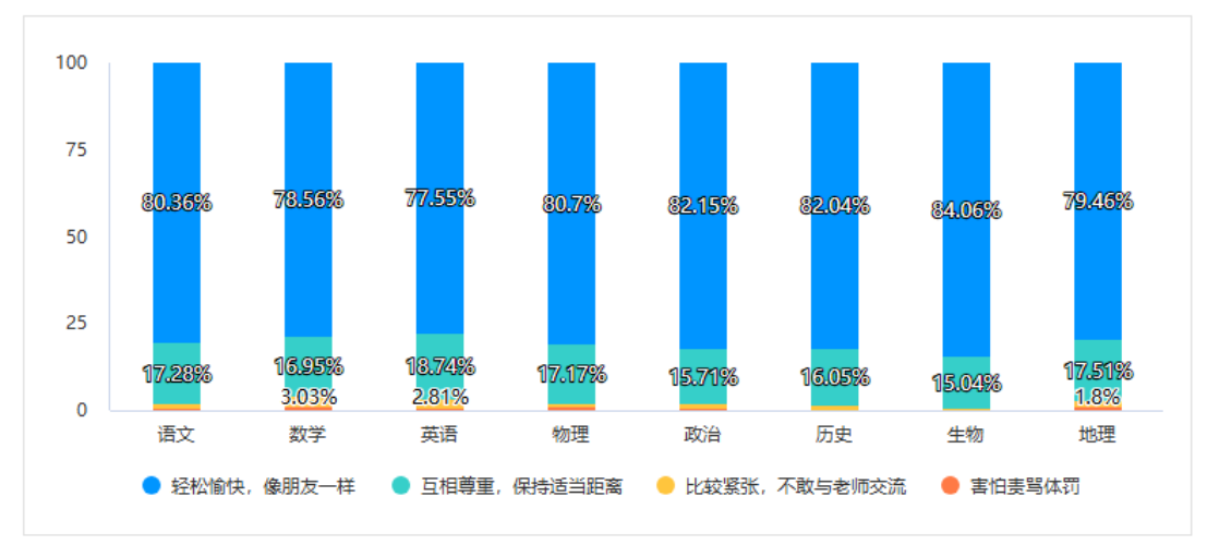 1. 学生与各学科教师相处感受整体积极,生物学科师生关系最融洽