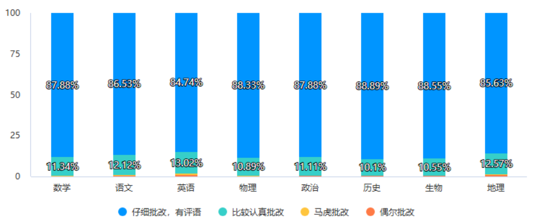 4. 各学科教师在作业批改上的整体表现优秀,但存在学科间细微差异