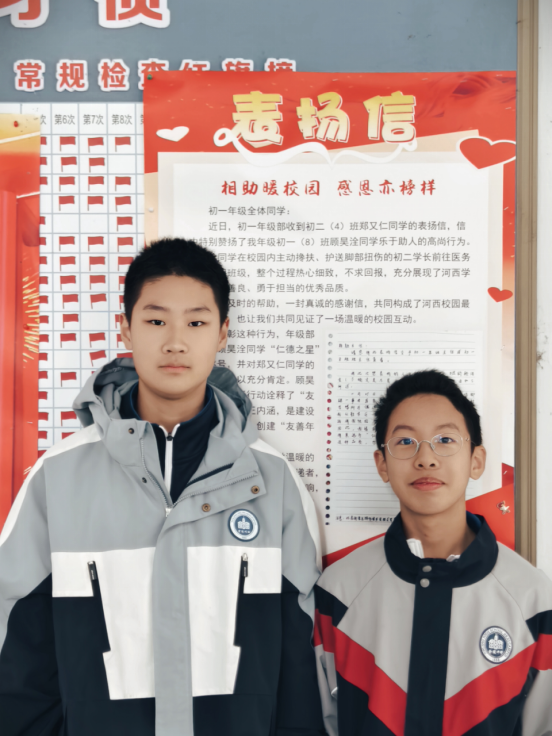 10月29日晚,初二(4)班郑又仁同学因脚部扭伤,在教学区至医务室的路上艰难前行。此时,初一(8)班顾昊洤同学主动上前搀扶,一路陪伴他就医并护送回班。这一看似平凡的举动,却被郑又仁铭记于心。他在表扬信中写道:“他不求回报,乐于助人,我希望他能被选为‘仁德之星’。”
