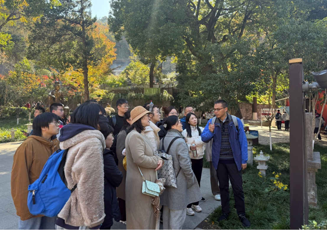 上午8:45,身着统一校服的同学们在钟楼附近集结,怀揣期待登上校车。经过约一个小时的车程,队伍顺利抵达栖霞山。漫步“彩虹明镜”之称的明镜湖畔,九曲桥连湖心亭的精巧景致让同学们驻足流连;走进始建于南齐的栖霞寺,作为江南佛教三论宗发祥地的千年古刹,其与灵岩寺、玉泉寺、国清寺并称“天下四大丛林”的深厚底蕴,让大家沉浸式感受历史与宗教文化的魅力。在宋代舍利塔旁、千佛岩下,515尊造型精美的佛像依山而建,同学们认真聆听讲解,了解古迹背后的历史故事,不时驻足观察、交流探讨。