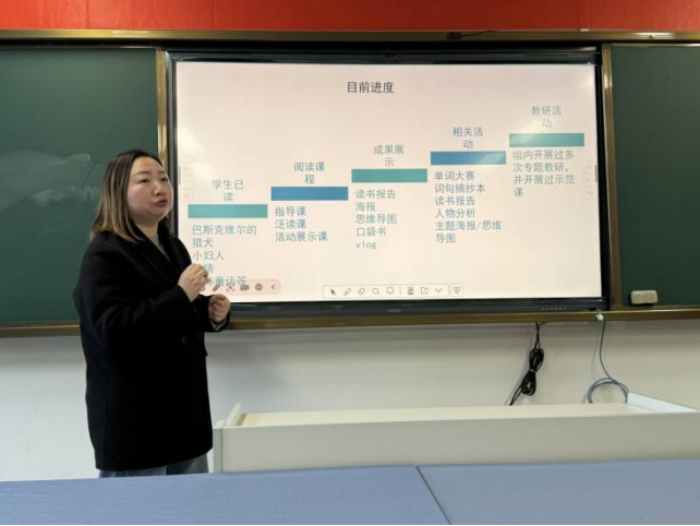 窦可嘉老师围绕初中英语整本书阅读课题,汇报文献积累与学生阅读实践进展,梳理《巴斯克维尔的猎犬》等书目实施成效,并提出丰富理论研读、确定分级书目、创新活动形式的后续规划。