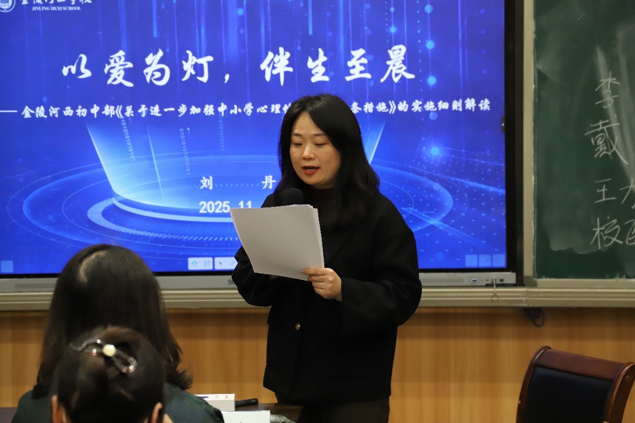 为进一步深化家校共育,构建家校沟通的坚实桥梁,汇聚教育合力,共同为学生的全面成长赋能,2025年11月19日晚6时30分,金陵河西学校初中部在党员活动室隆重举行了以“同频润心,守护青春”为主题的2025-2026年度家长委员会成立大会。初中部校长戴蓉、副校长李宏伟、许红兵、倪长娥,学工处主任钱静、三位年级部主任及新当选的家委会全体成员共同出席了此次会议,会议由学工处钱静主任主持。