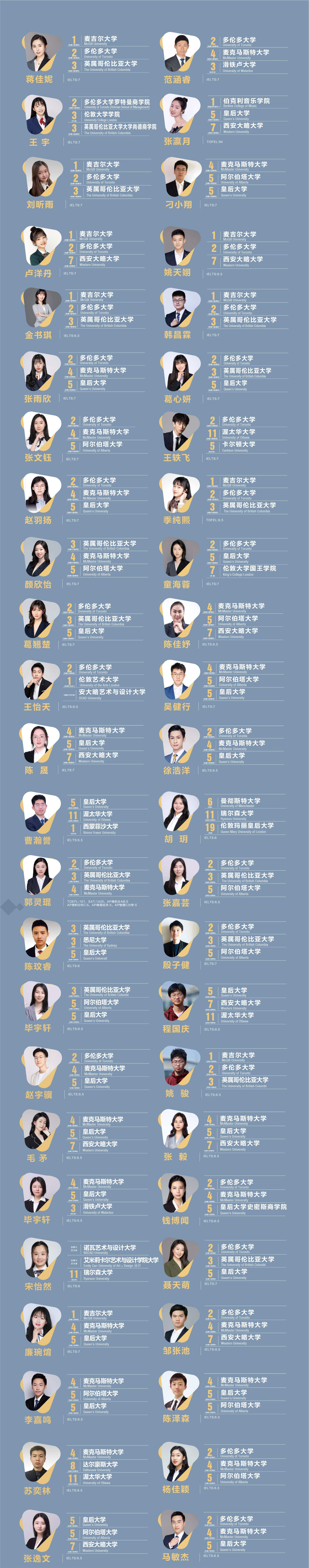 截止2020年6月11日,61名高三学生申请加拿大大学,68%的学生被加拿大前3大学录取,98%的学生被加拿大前5大学录取,其中: