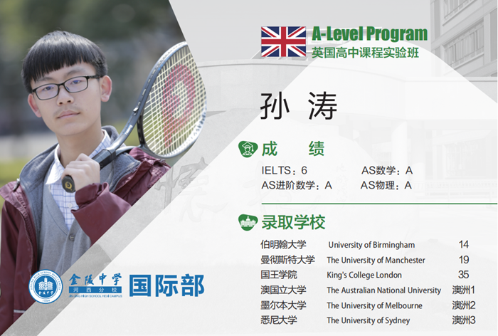 35位毕业生申请英国大学,G5超级精英大学伦敦大学学院9人,圣安德鲁斯大学(英国排名3)1人,拉夫堡大学(英国排名第5)1人,兰卡斯特大学(英国排名6)5人,杜伦大学(英国排名7)9人,华威大学(英国排名10)6人,69%的学生获得了英国前10大学的录取,94%的学生获得了英国前20大学的录取!