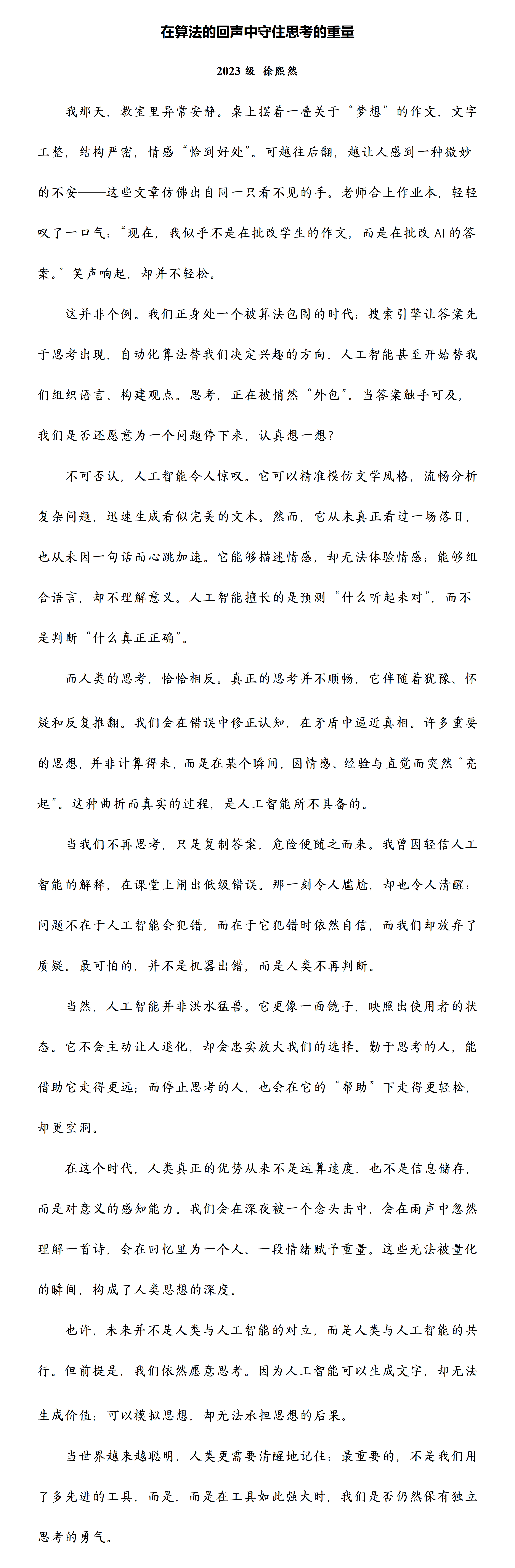 【学生佳作】徐熙然:《在算法的回声中守住思考的重量》