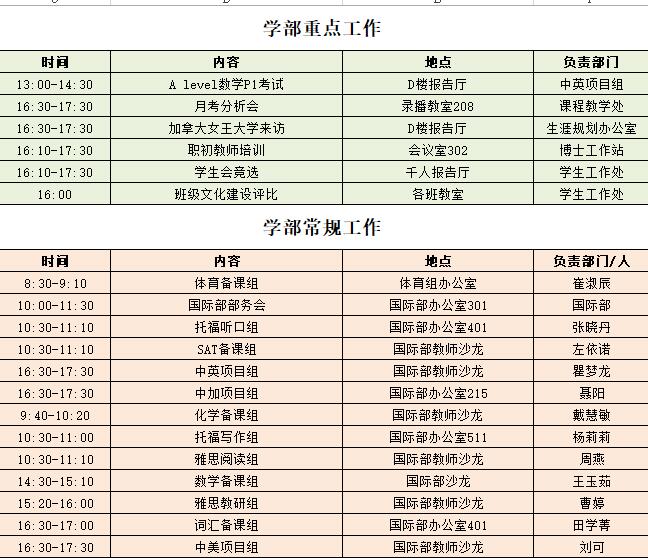 日期 星期几 时间 内容 地点 负责部门 参加人员