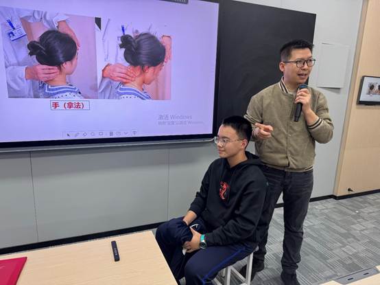 2. 舒缓颈肩酸痛的“拿肩井、按风池”:用对侧手的拇指与食、中二指,捏拿对侧肩部正中的肩井穴区域;再用双手拇指指端,按揉头后颈部两侧、枕骨之下的风池穴。他亲自走到学生中间,纠正大家的姿势和力度,确保每个人都能准确找到穴位并掌握正确手法。