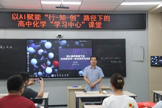 公开课后,南京市金陵中学河西分校的赵建宁校长作了题为《融合AI技术,构建高中化学学习中心课堂》的专题讲座。赵校长从理论层面分析了AI技术在个性化学习、数据分析与反馈等方面的优势,并结合实际案例,分享了如何利用AI工具优化教学设计,提升课堂的互动性和实效性。