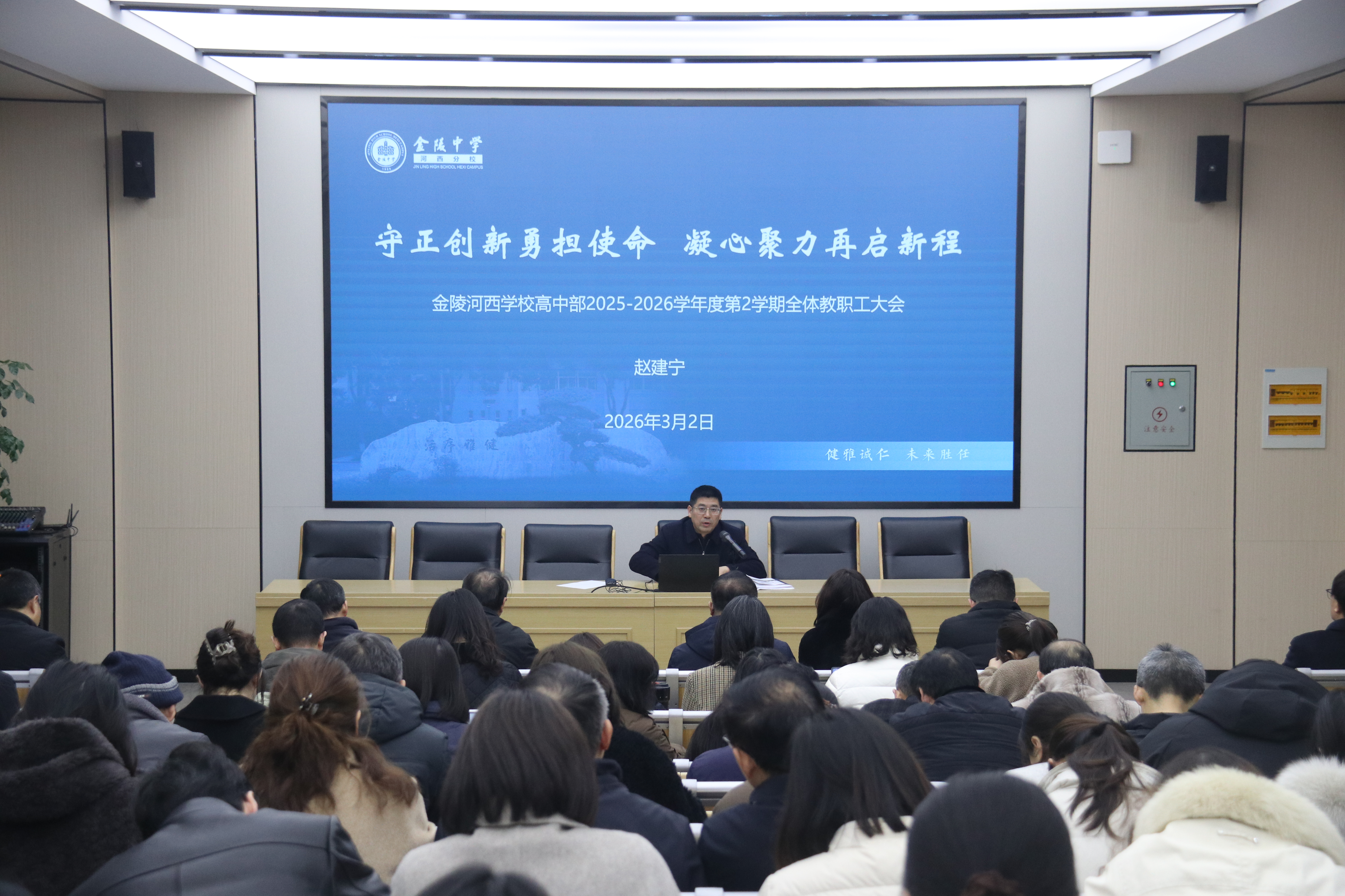梅花绽放,万象更新,金陵的春天生机盎然。为明确新学期发展方向,凝聚全体教职工奋进力量,确保各项工作开好局、起好步,高中部于3月2日上午在D楼报告厅隆重召开2025-2026学年度第二学期期初全体教职工大会。高中部全体教职工齐聚一堂,以“策马春风里,万事行为先”的昂扬姿态,共同擘画新学期发展蓝图。会议由综合办公室侯燕红主任主持,课程教学处张新桥主任作了专题分享,高中部赵建宁校长作了题为《守正创新勇担使命,凝心聚力再启新程》的新学期工作部署。 高中部课程教学处张新桥主任作《AI时代课堂教学的转型之路》专题分享。张主任从"理念先行、方法跟进、内容重构"三个维度,系统阐述了人工智能背景下的教学改革路径。 张主任指出,面对教育部2026年1号文件提出的“加强教考衔接、优化命题方式、创新考查形式”等新要求,课堂教学必须实现三大变革:从“教为中心”转向“学为中心”,从“知识本位”转向“素养本位”,从“经验驱动”转向“数据驱动”。他详细解读了“行-知-创”教学路径,倡导通过大单元教学、项目式学习、真实情境问题设计等方式,培养学生关键能力、学科素养和思维品质,构建“以学生发展为中心”的新型课堂范式。 赵建宁校长首先回顾了寒假期间各项工作:高三年级为298名毕业生建立精准画像,实施“一班一策、一人一策”的靶向备考;基础年级积极推进学科竞赛培训、线上学业指导及研学实践活动,实现了“假期不停学,成长不打烊”。 立足新起点,赵校长深入解读《教育强国建设规划纲要(2024-2035年)》及教育部2026年1号文件精神,明确新学期“育人为本、质量立校、特色兴校、创新强校”的指导思想,提出以“高品质、特色化、创新性”为核心的工作目标:2026届高考本一达线率突破96%,南京市前500名达4人,前2000名超50人,力争南京市发展性评估“卓越奖”;学科竞赛省奖突破150人次,信息学奥赛力争全国金牌2人。 赵校长重点部署了五项重点工作:一是项目化推进科学高中建设,完善"基础+拓展+研究"科学课程群;二是深学笃行1号文精神,推动AI赋能课堂深度转型;三是强化教研合作,深化与高校、科研院所的联动;四是建强师资队伍,实施"名师计划"与"青蓝工程";五是促进学生全面发展,优化招生保障机制。 会议最后,高中部对开学初各项工作进行了具体安排。根据《高中部2026年开学前工作