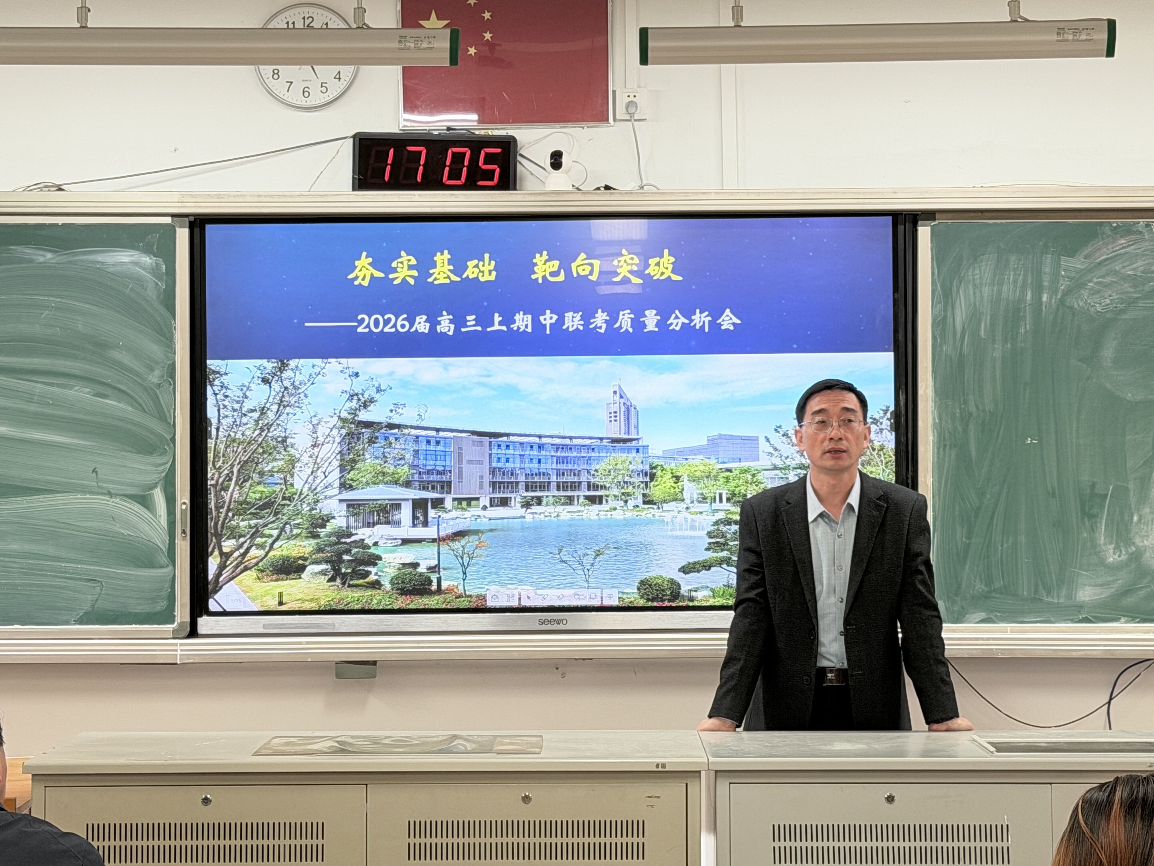 会议伊始,赵建宁校长发表讲话。他立足于全市教育发展大局,结合教育局最新的政策导向与测算数据,对2026届高考面临的形势与机遇进行了深度解读。赵校长指出,科学的目标是行动的灯塔,要求各班级、各学科必须在充分研究学情、考情的基础上,制定量化目标体系,并将目标层层分解,落实到每一个备课组、每一位教师、每一位学生。