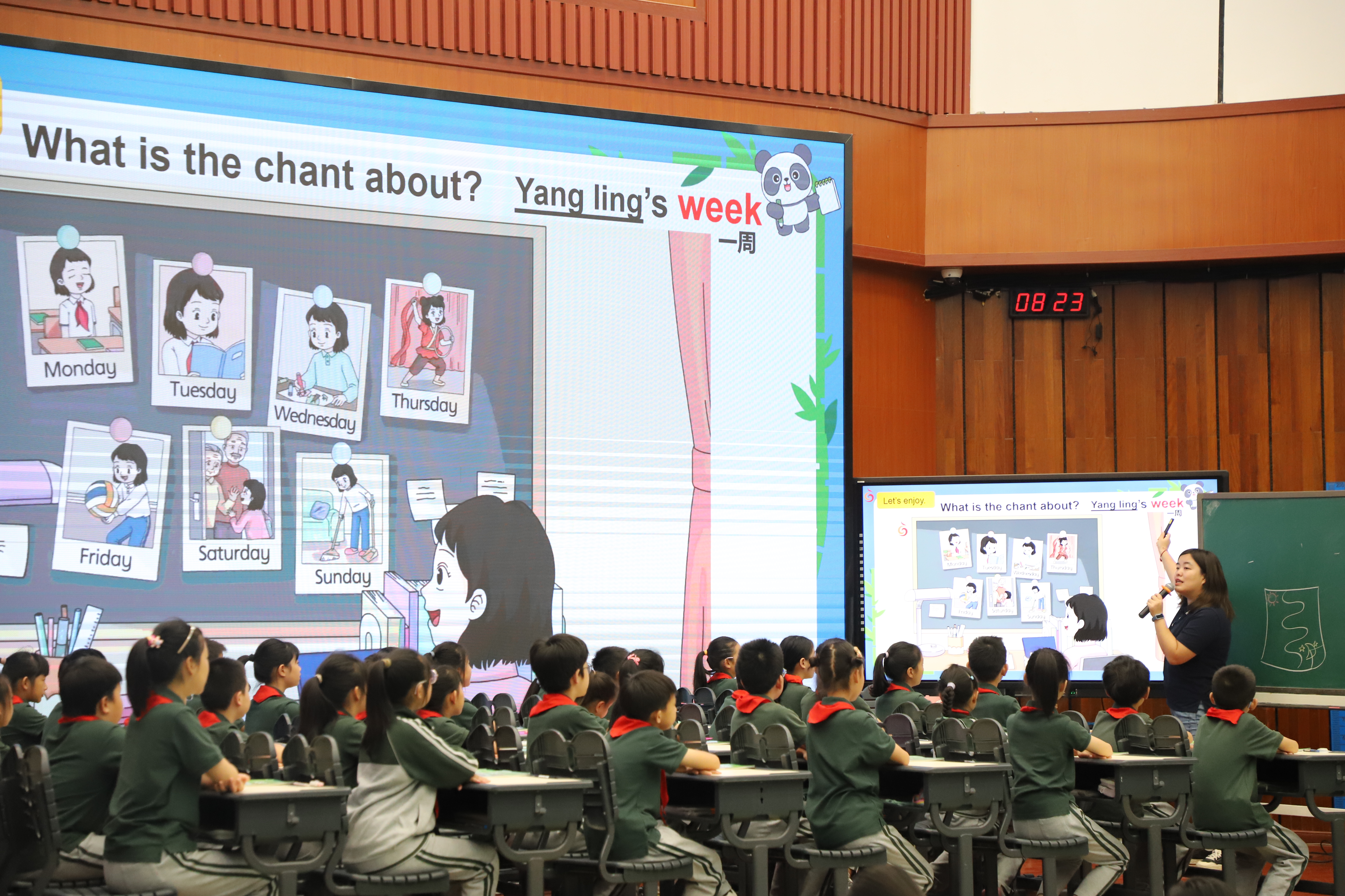 第一节课由顾颖龄老师带来译林四上《Unit 3 My week》。上课伊始,一首Week Song点燃了课堂气氛,激活孩子们有关星期的词汇积累。随后,顾老师引导学生聆听Chant(Yang Ling’s week),从而自然过渡到一周七天的活动计划。她相机教授和练习周一到周日的七个单词表达,并结合学生实际说一说自己的周末两天计划,引出本单元的大问题:如何计划你的一周?然后,顾老师通过人物Mr Wilson早起这一部分进行文化拓展——三更灯火五更鸡,正是男儿读书时。通过和中国古诗的文化链接深化了学生对主题意义的理解。
