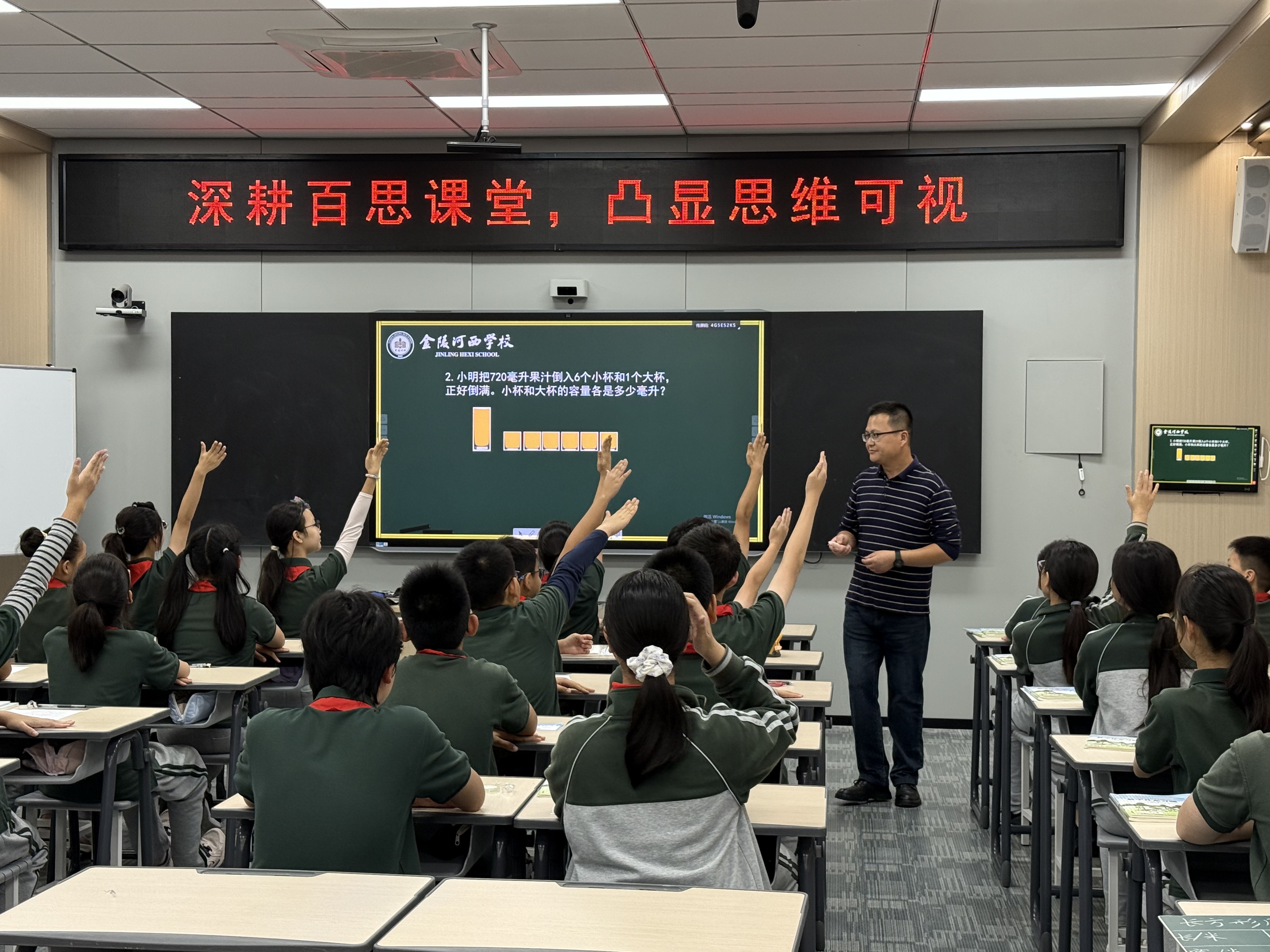 2025年10月14日下午,金陵河西学校小学部录播教室内气氛热烈,一场以“深耕百思课堂,凸显思维可视”为主题的高段数学教研活动在此拉开帷幕。小学部全体高段数学教师齐聚一堂,共同聚焦“解决问题的策略”教学,通过课堂观摩、说课评课、专家总结等环节,深入探讨数学思维培养的有效路径。