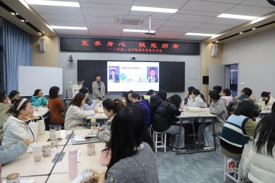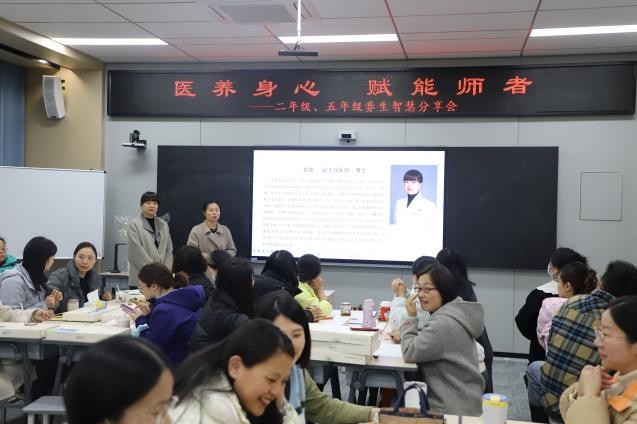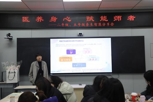 为切实关怀教师身心健康,帮助教师缓解工作压力,提升自我养生能力,近日,金陵河西学校二年级与五年级组联合举办了一场别开生面的团建活动。本次活动以“医养身心赋能师者”为主题,特别邀请养生专家南京市妇幼保健院营养科苗苗主任开展养生智慧分享会,为老师们送上了一场实用又暖心的健康盛宴,活动现场氛围热烈,收获满满。
