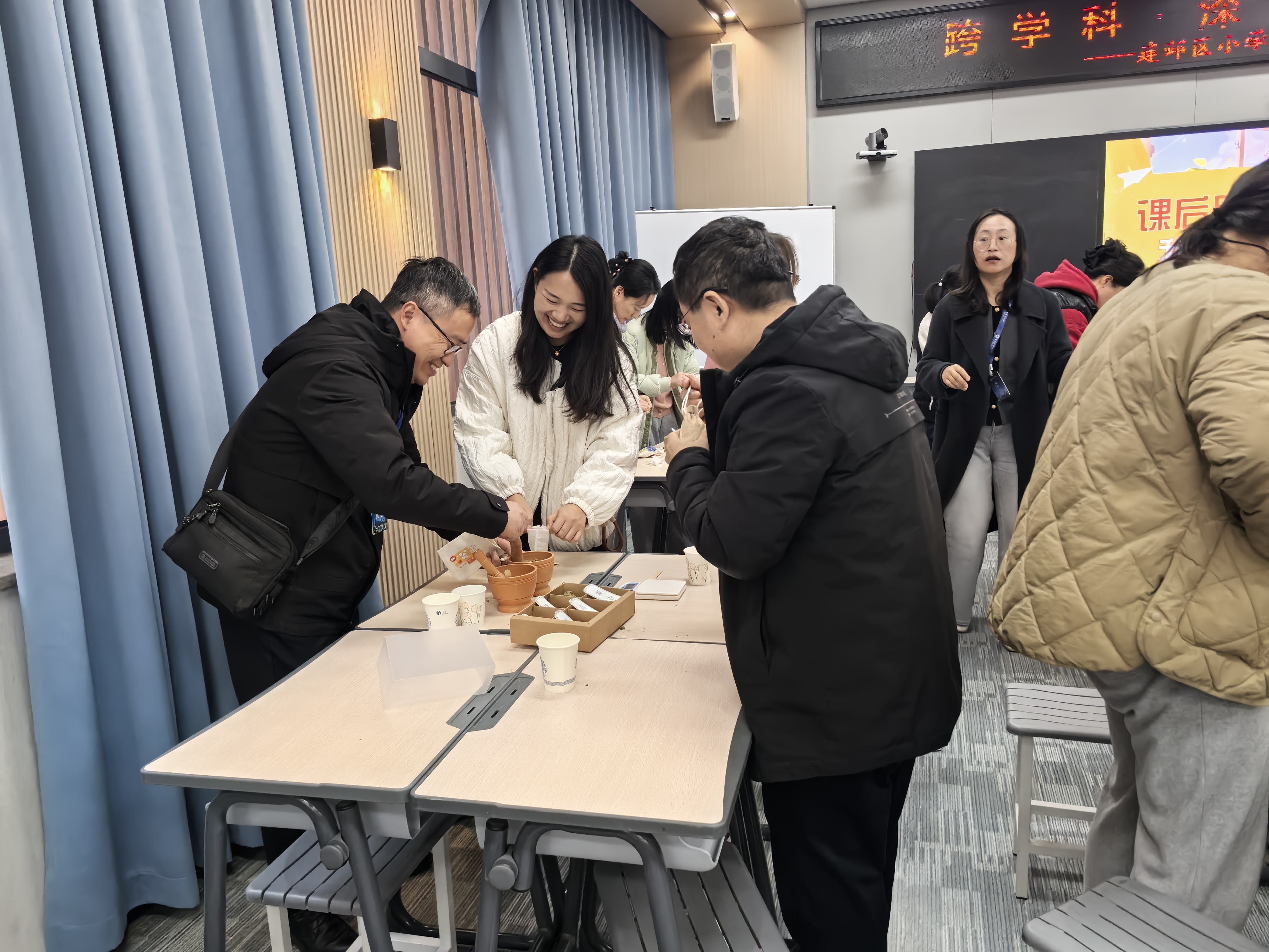 随后是体验制作香囊的环节,在第一节课后,教师们亲身体验了手工制作香囊的实践环节。在尹文婷老师的指导下,大家选用药材、称重装袋,在动手操作中深入感受中医药文化的内涵。现场气氛热烈,香囊制作不仅延续了课堂所学,也为“做中学”的跨学科实践提供了生动范例。