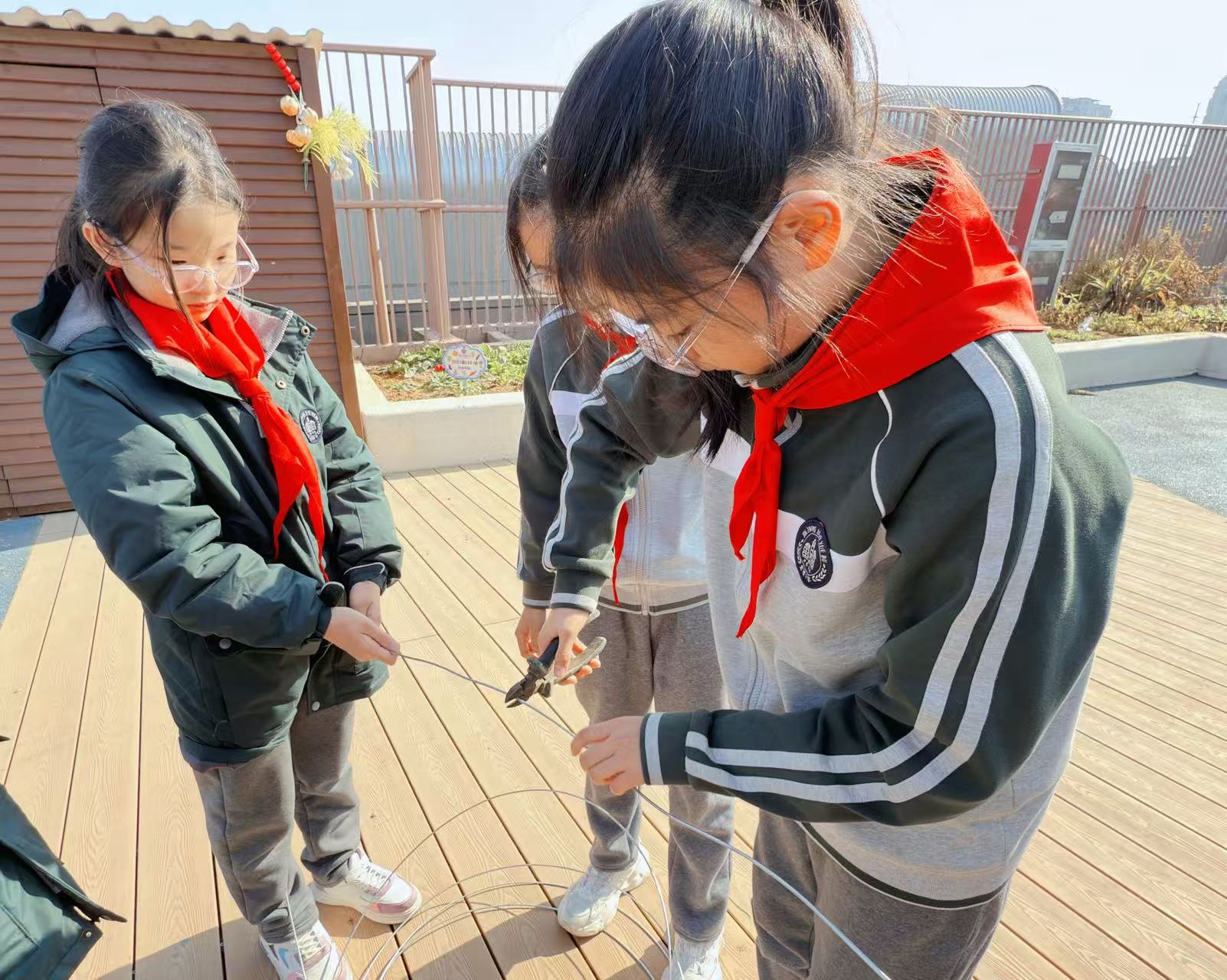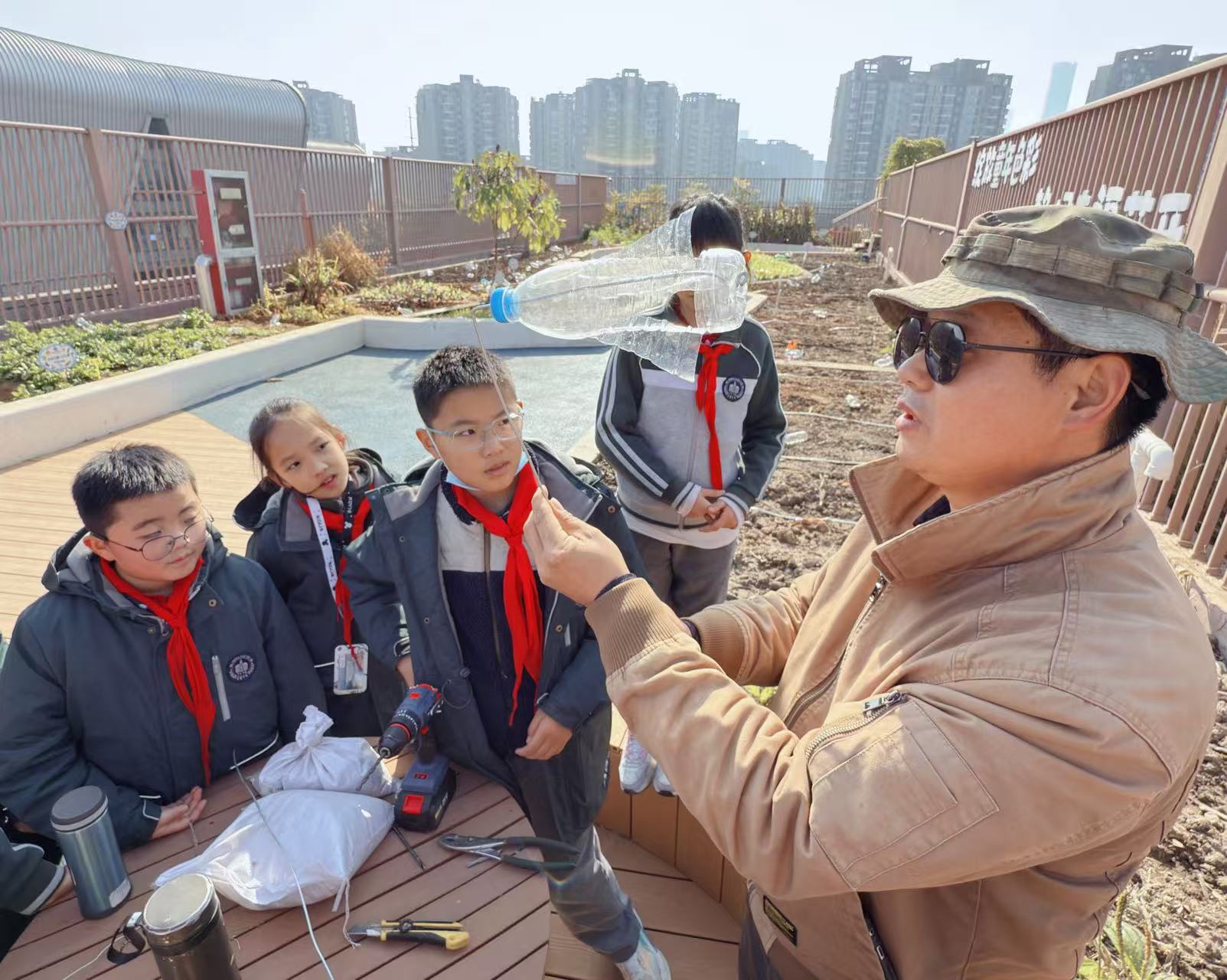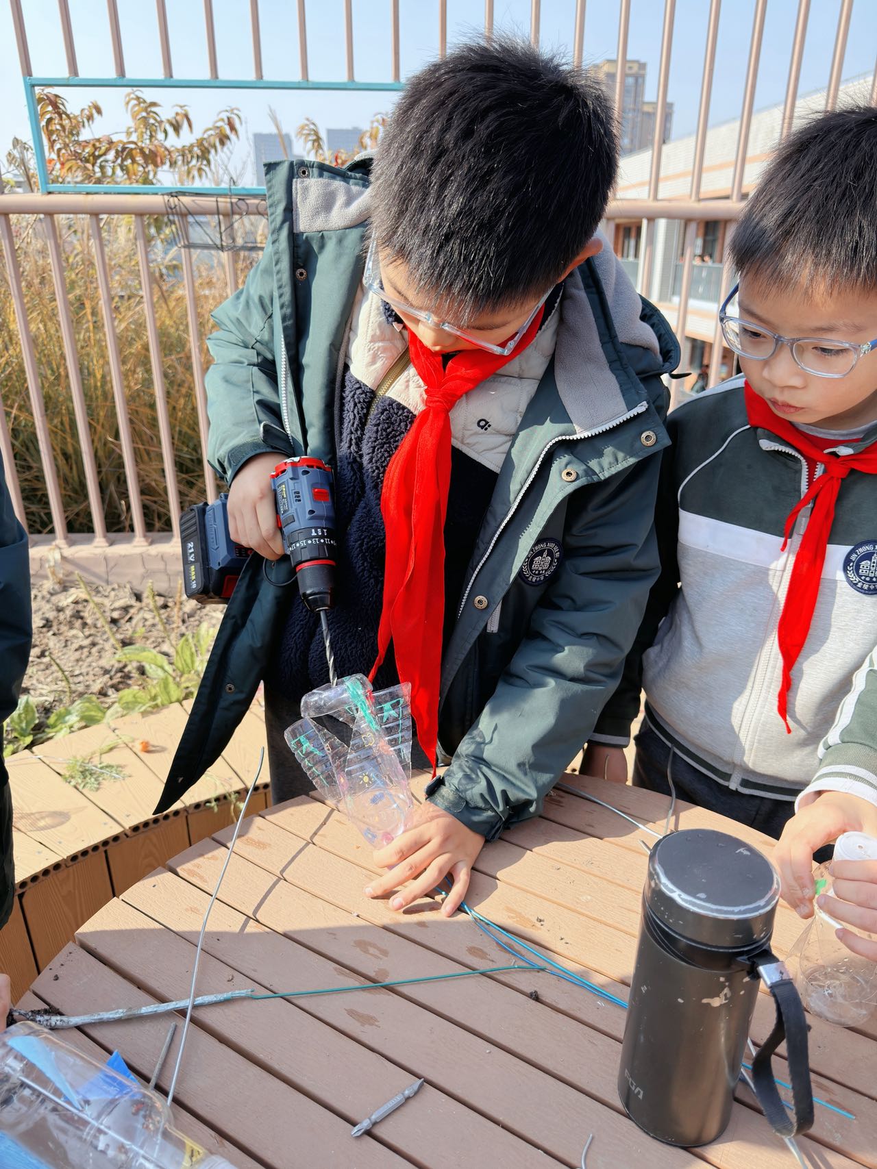 12月5日中午,金陵河西小学百味农场里热闹非凡。五年级学生们围绕着田间的驱鸟器,在万老师的指导下开展改造实践,用智慧和双手解决农场种植中的实际难题。