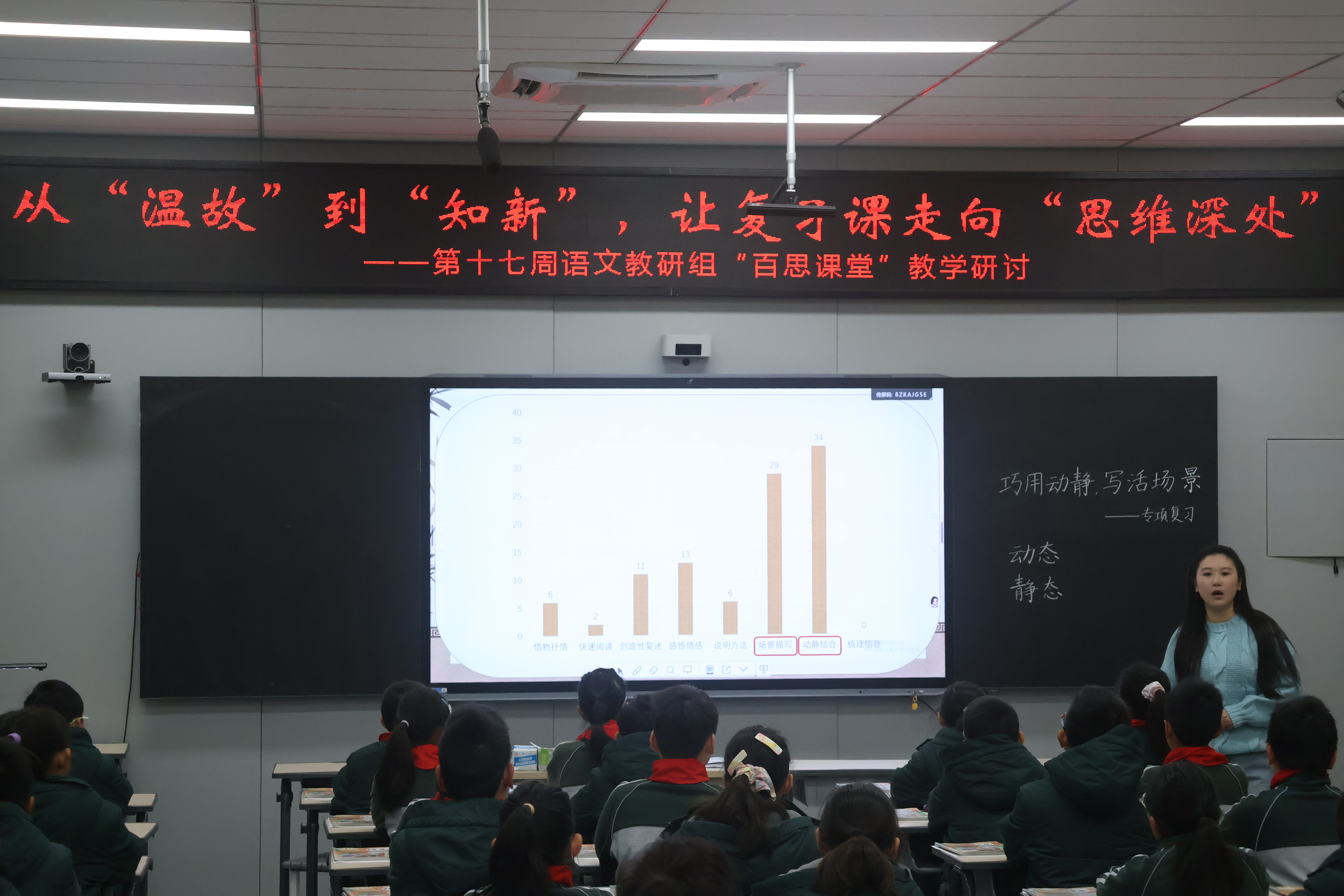 五年级李婧老师带来《巧用动静,写活场景》专项复习课,以“动静结合”为核心,通过回顾旧知、品读文本、实践写作、多元评价等环节,设计阶梯化学习任务,引导学生从被动辨识课文中的静动态描写,过渡到主动结合生活场景灵活运用技法描写景物变化,让学生在实践中掌握表达技巧。