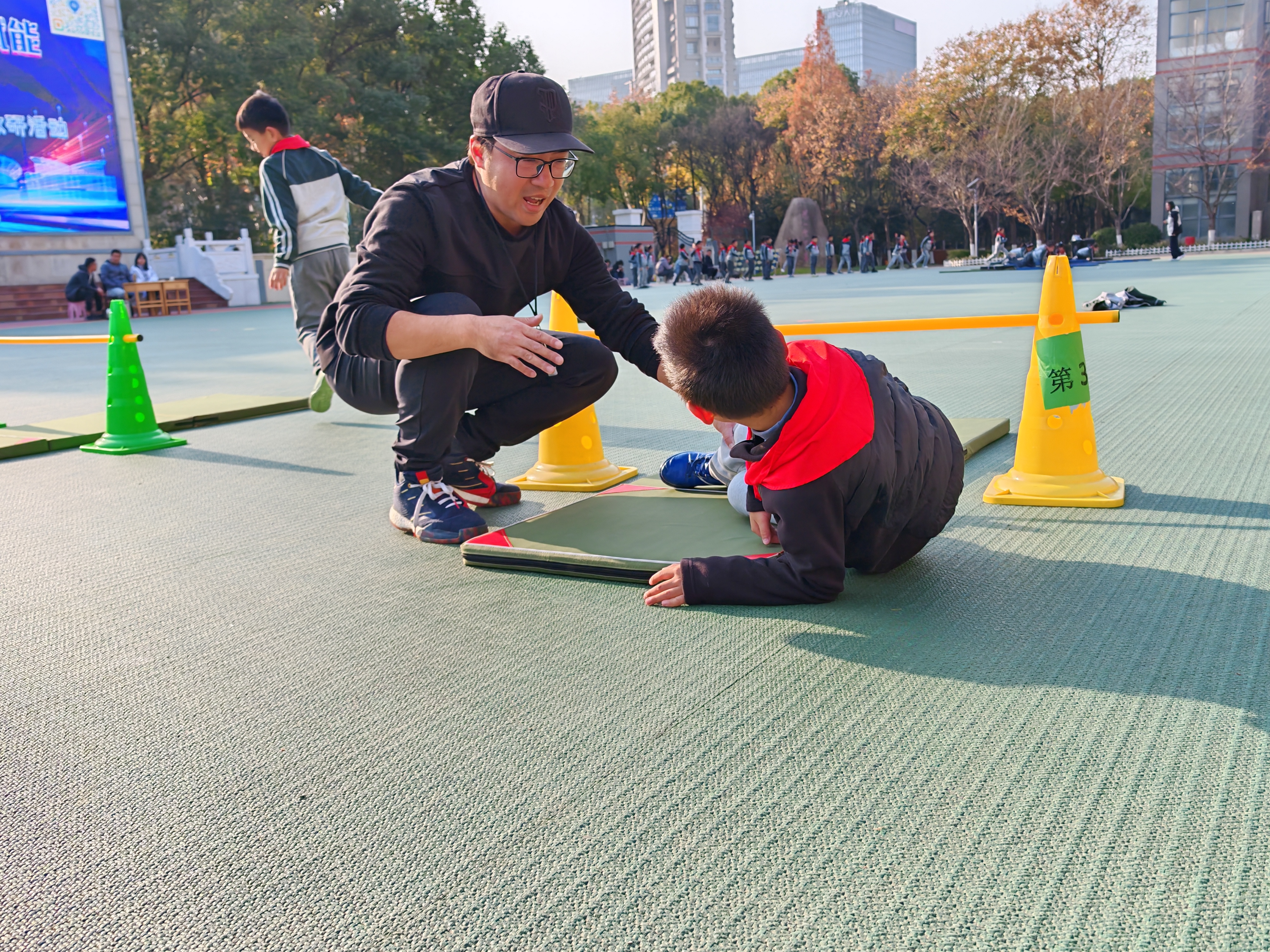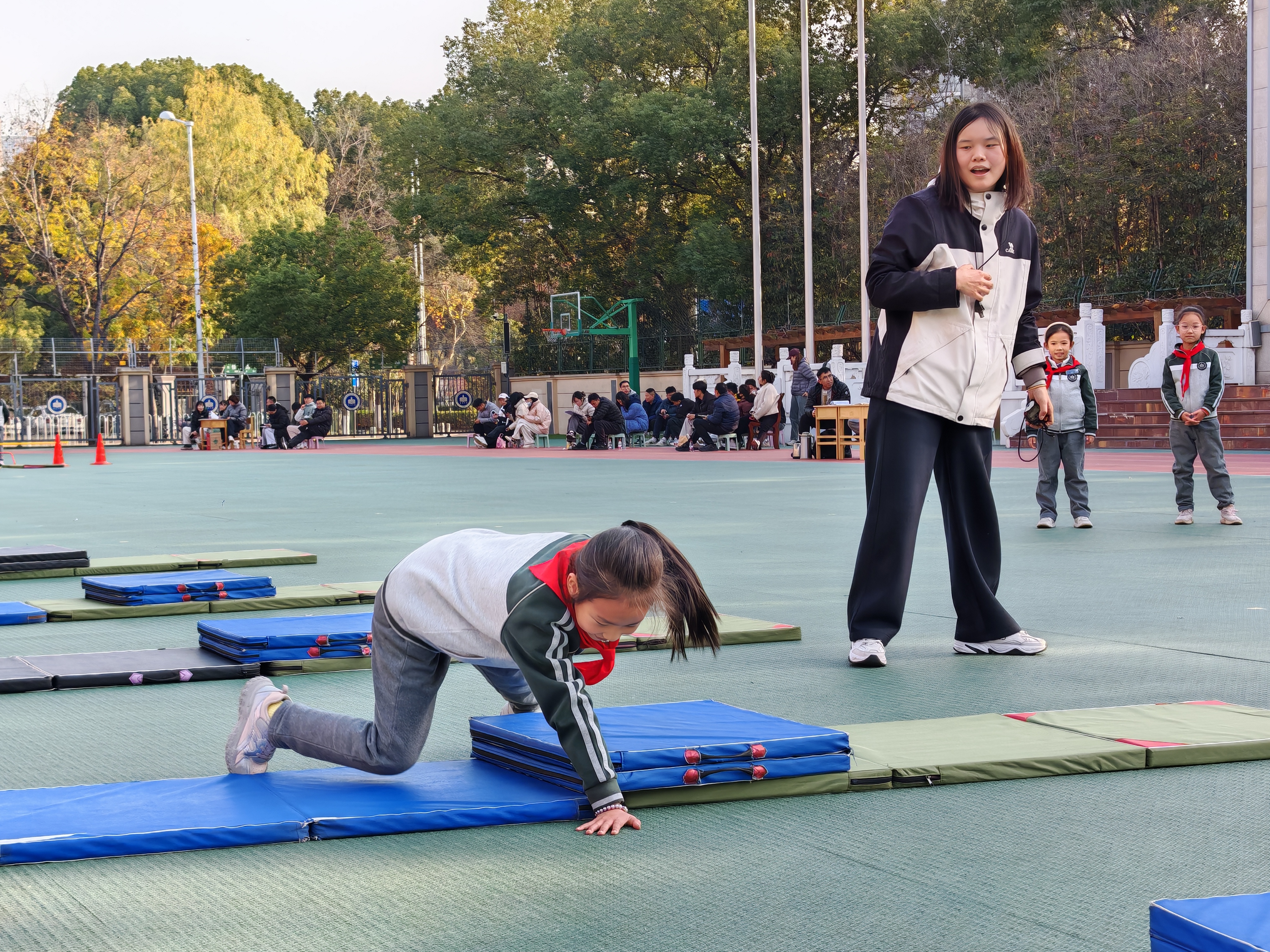 建邺实小分校魏伟秋以垫子为障碍载体,通过趣味慢跑、徒手操热身激活身体,先让学生自主探究过障碍方法,再分组学练跪撑爬行、手脚并用支撑、跨越等技能。既让学生掌握多种过障碍方式、提升身体素质,又培养了勇敢品格与团队协作精神。