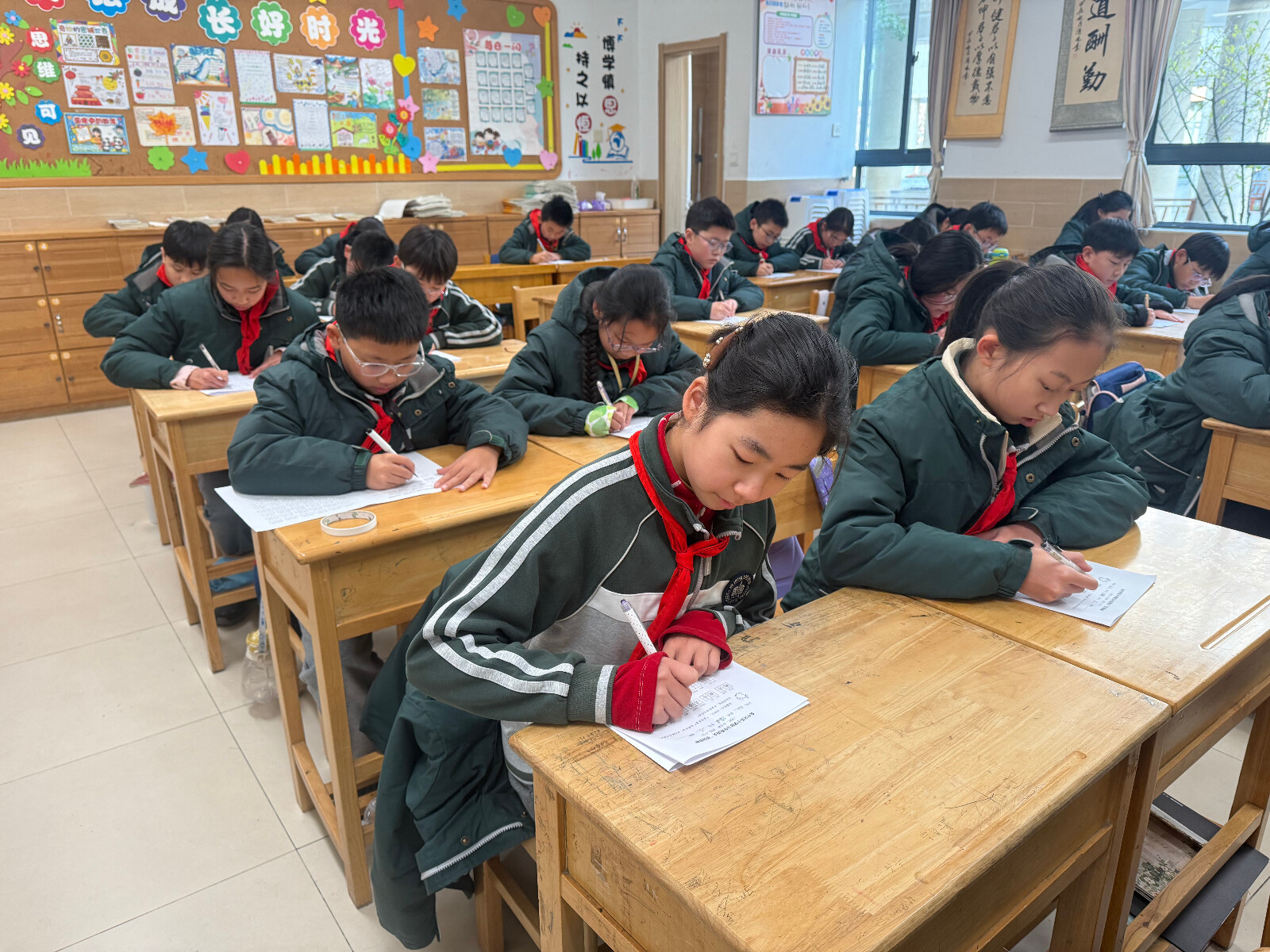 竞赛开始后,教室内秩序井然。同学们全神贯注,认真拼读每一个音节,手握笔杆,在答卷上工工整整地书写。有的同学下笔如飞,胸有成竹;有的同学则一丝不苟,反复斟酌,生怕出现一丝疏漏。五年级语文组的老师们分工明确,认真履行监考职责,确保竞赛公平、公正、公开地进行。沙沙的写字声,成为了赛场最动听的旋律。