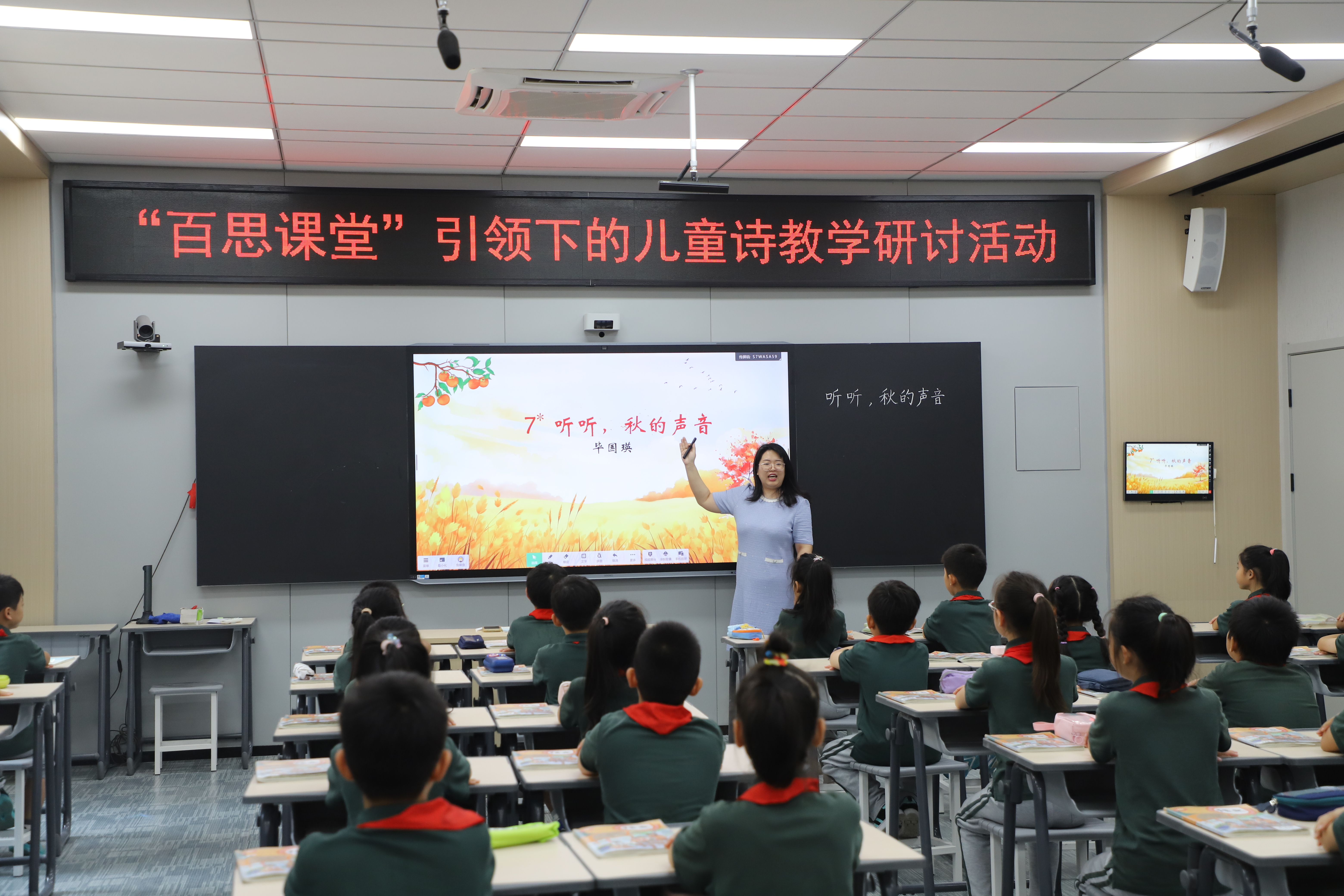 9月,余洁老师执教《听听,秋的声音》示范课,孙双金名师工作室成员及全校语文教师共同观摩研讨。课堂生动诠释“百思课堂”理念,引导学生捕捉秋声、表达诗情。