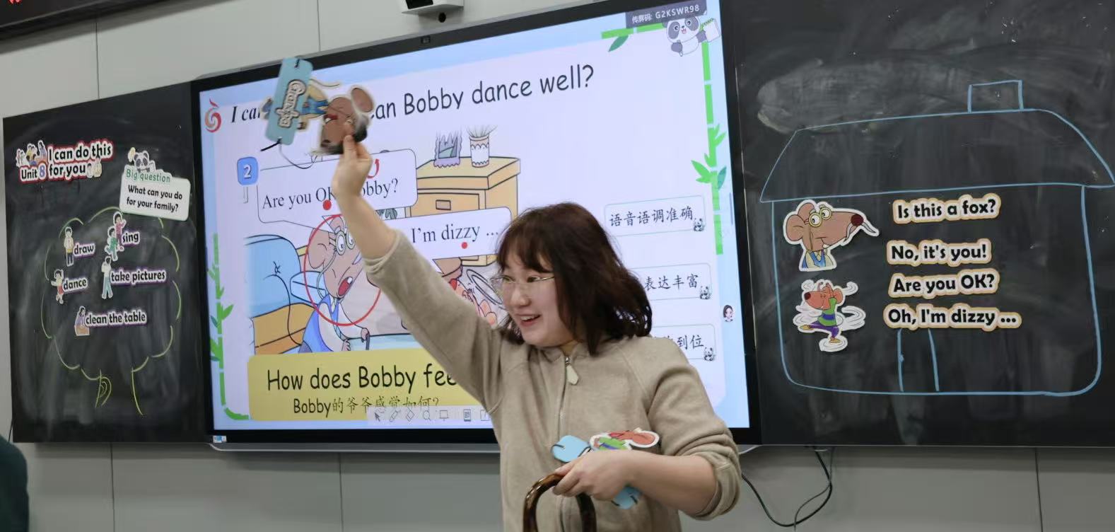 活动首先由我校鲍苏宁老师执教三年级上册《Unit 8 I can do this for you》的Lead in与Cartoon time板块。鲍老师以一段师生共创的英文说唱互动开场,有效激活学生已有知识,营造出轻松愉悦的学习氛围。课堂围绕“家庭”这一主题,通过层层递进的问题链,引导学生思考“我可以为家人做什么”。学生从插图入手,理解并表达家庭成员之间的互助行为,并通过编创新歌谣等方式拓展思维,在任务驱动中实现语言内化与情感共鸣,深刻体会到“家庭之爱源于彼此的付出”。