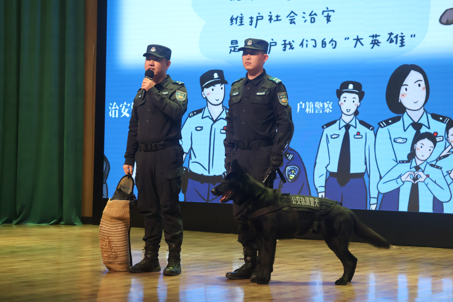 警犬互动环节:南京市公安局轨道交通分局的民警携警犬登场,成为全场最受瞩目的环节警犬在民警的指令下,精准完成了搜物、警戒等演示动作,灵敏的反应、矫健的身姿牢牢抓住了同学们的目光,大家不时发出惊叹与欢呼,纷纷围拢上前近距离观察,民警还耐心讲解了警犬在警务工作中的作用,让孩子们对这位“特殊战友”的工作有了深刻认识。