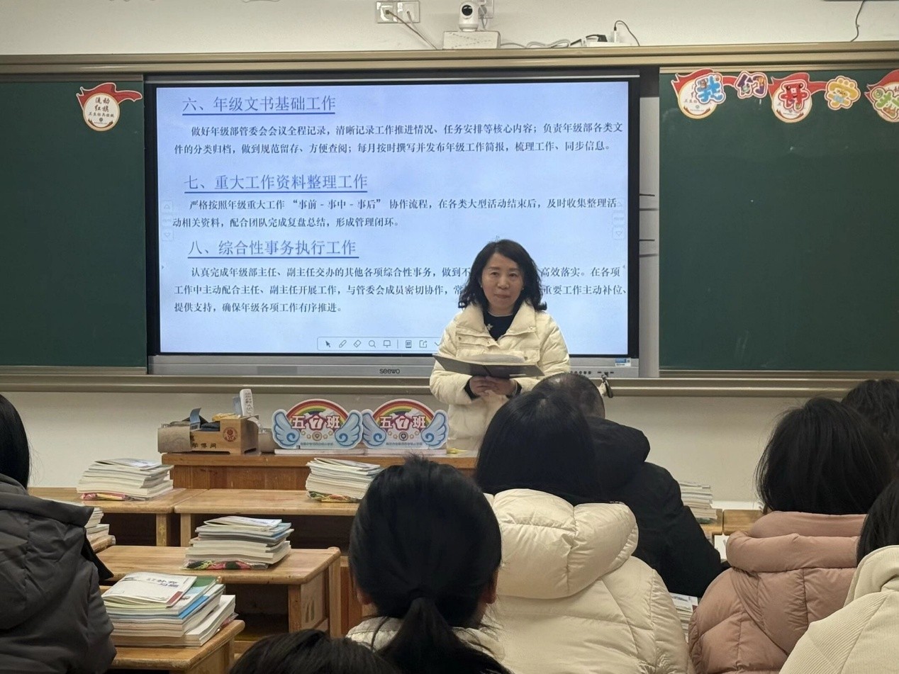 接着,方婷委员从教师专业发展服务、年级文化建设、宣传工作、物资保障等八个方面,明确年级部委员的工作职责与要求,强调做好各项服务保障,为年级工作有序开展筑牢支撑。