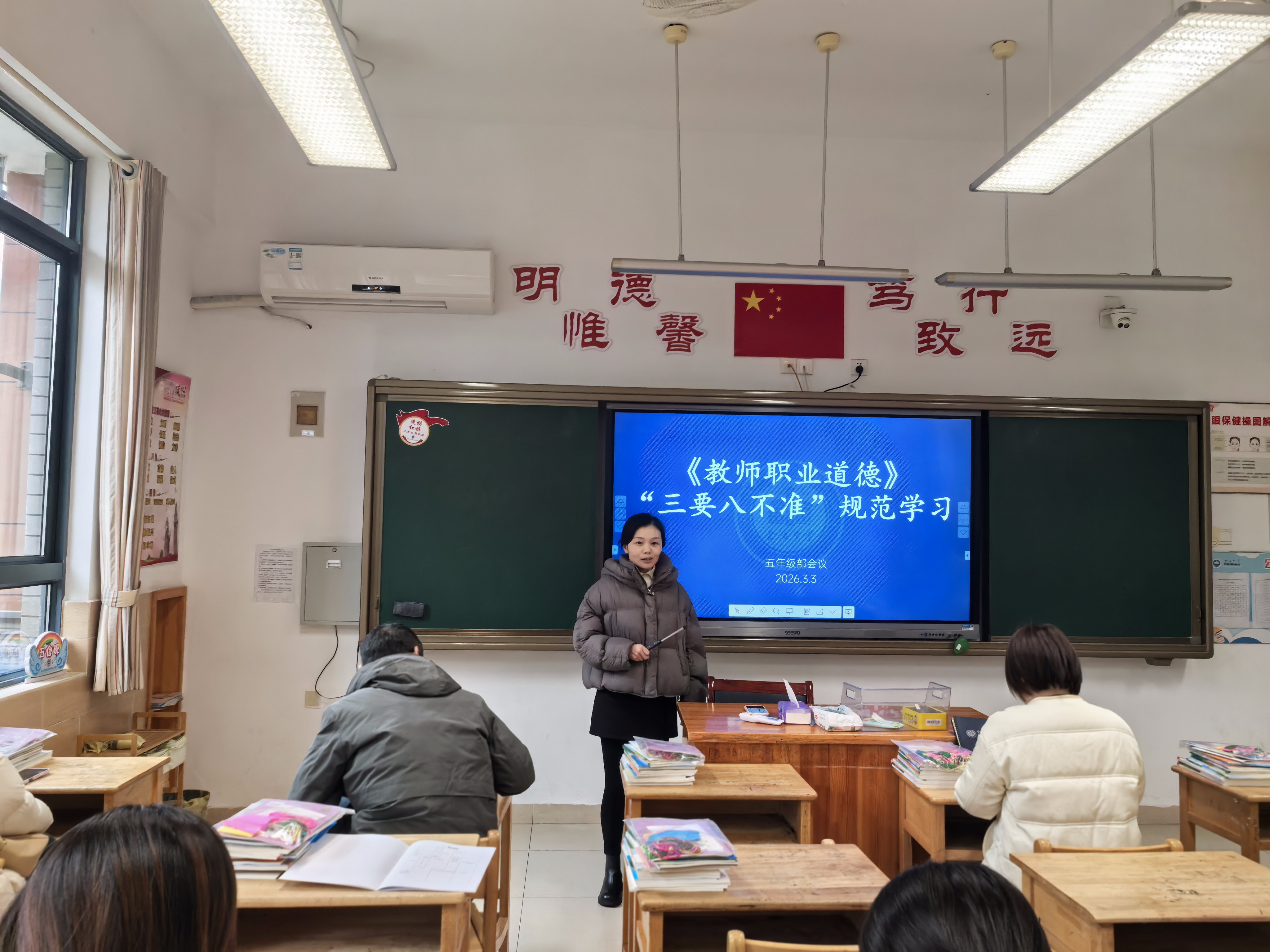 针对学生报道工作,会议要求引导学生完成“种子心愿卡”,以仪式感开启新学期成长之旅。全体教师共同学习了教师职业行为“三要八不准”,强化师德师风建设,筑牢职业底线。