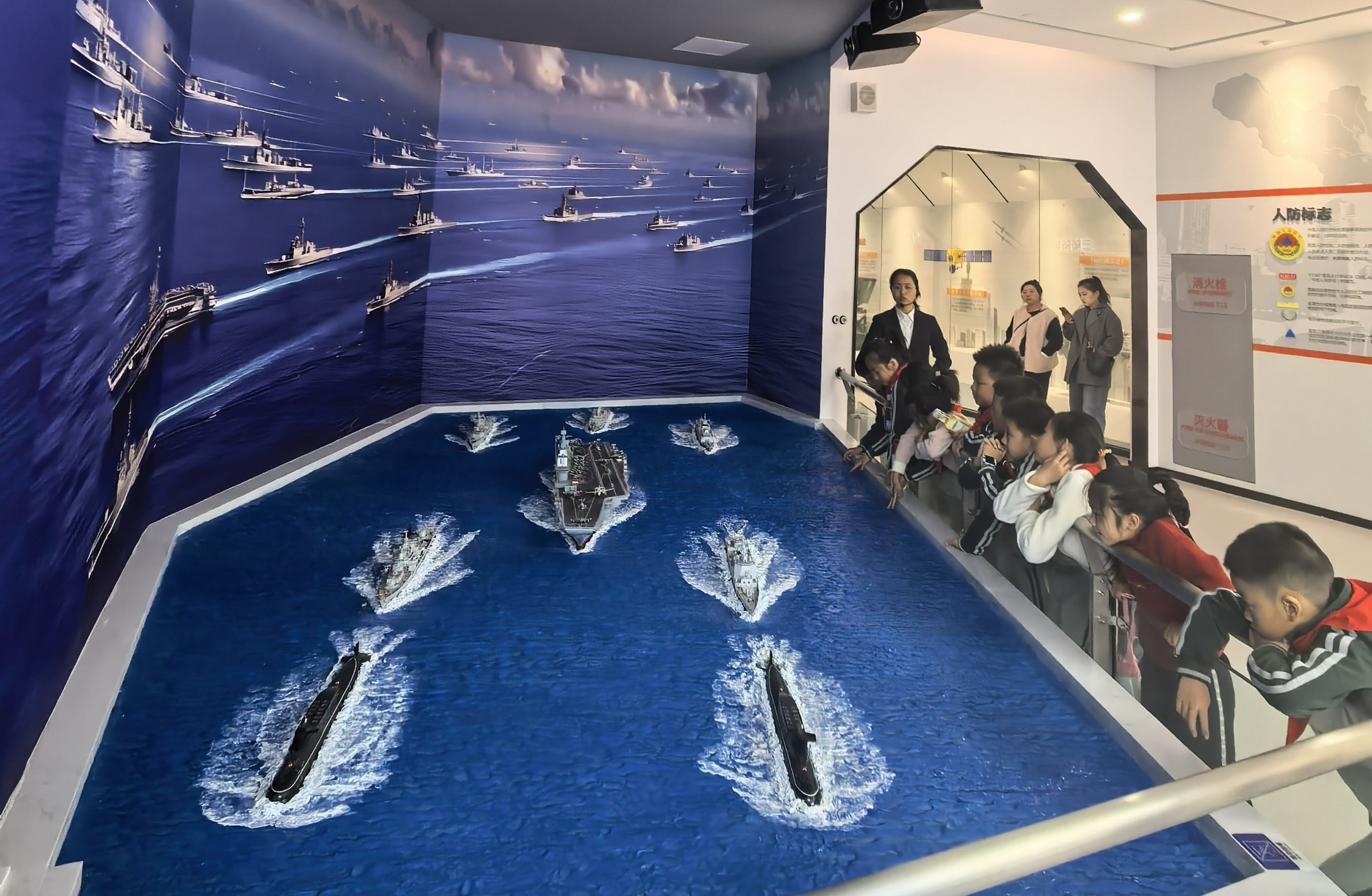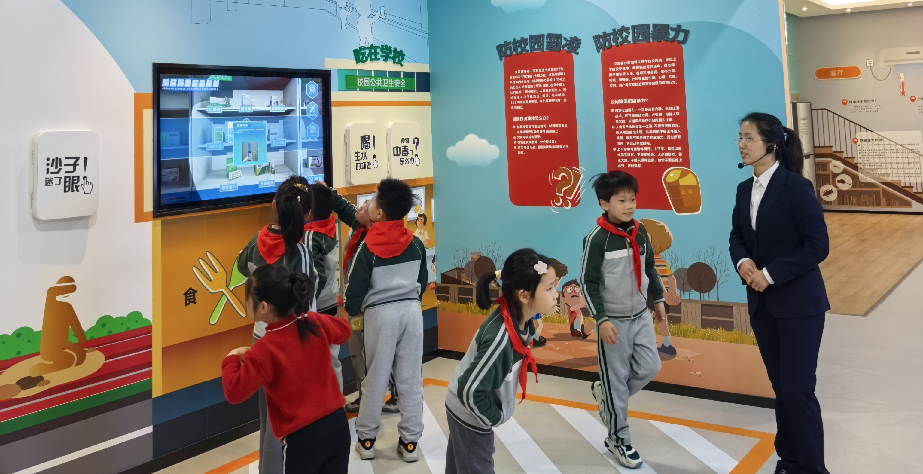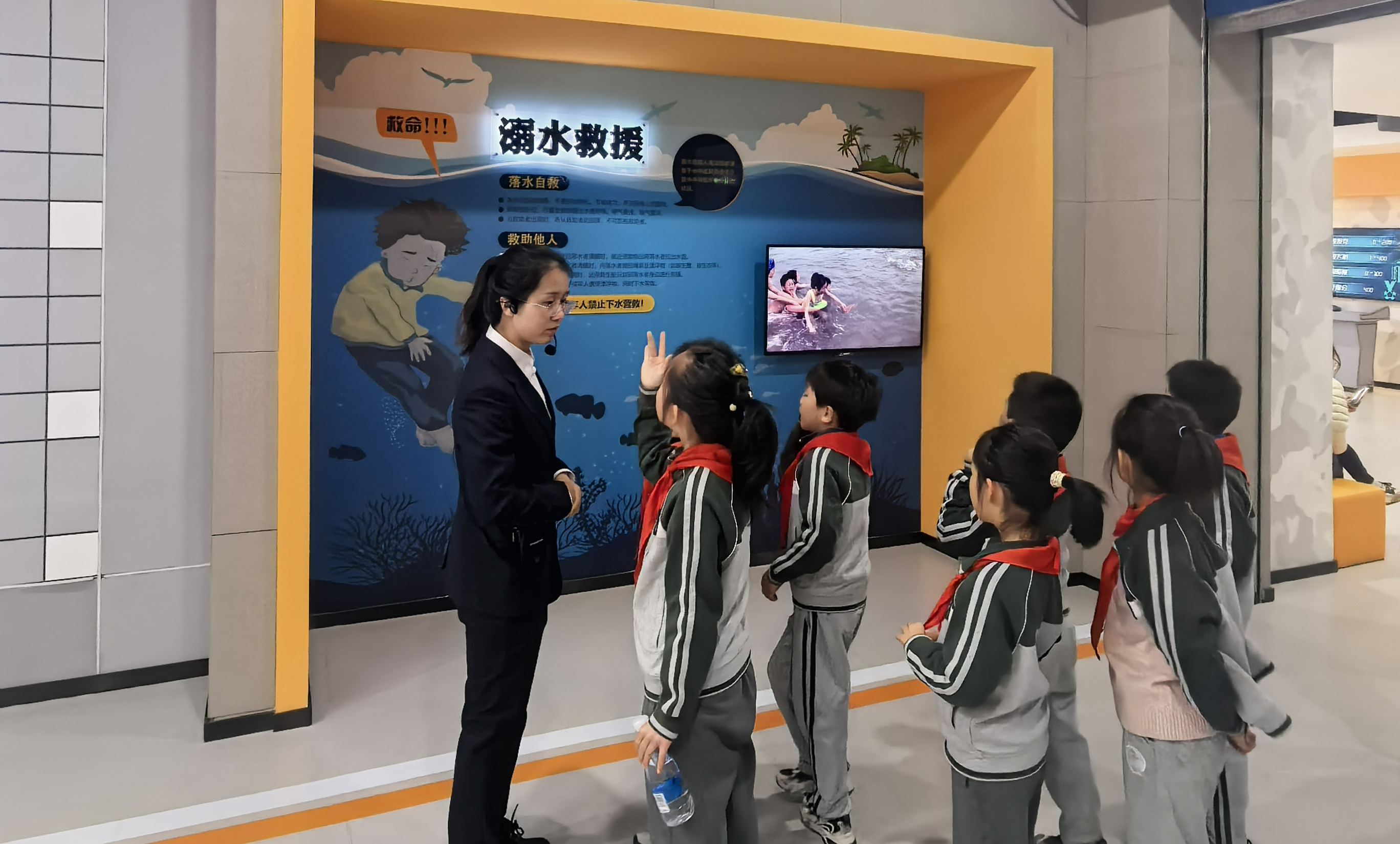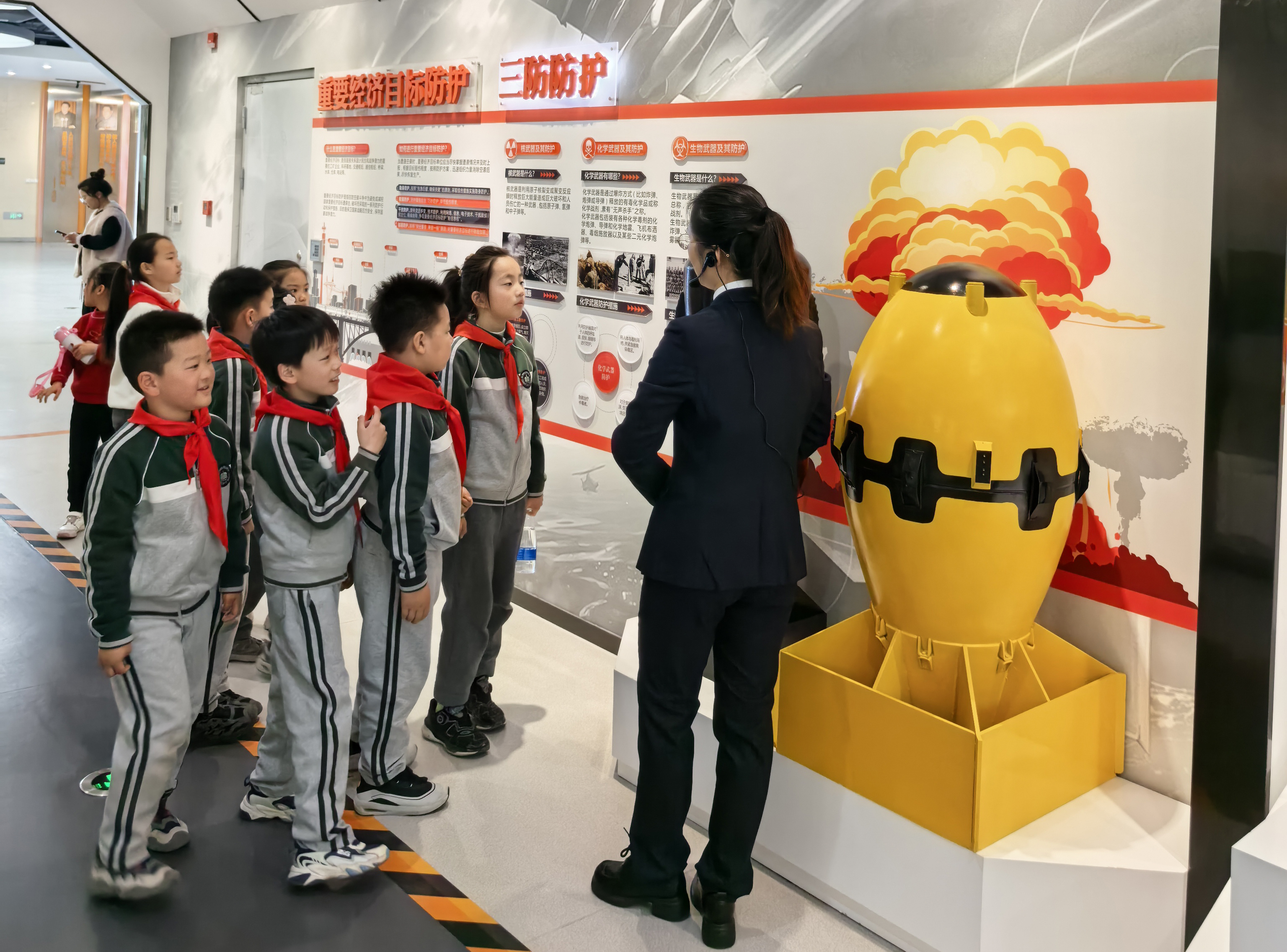 活动当天,学生们在带队老师和志愿者的带领下整队有序入馆,开启了一场趣味十足的“安全探索之旅”。在专业讲解员的引导下,孩子们分组参观了建设成就区、人民防空区、防灾减灾区等多个功能区域,全身心参与各项实操体验:亲手操作防护门、滤毒通风系统,直观认识人民防空基本设施;观看360°环幕模拟台风、海啸场景,体验5-8级地震震感,现场学习灾害来临时的躲避、防护技巧;通过交互装置了解核应急常识,观看防空袭主题7D影片,强化空袭警报识别与响应意识;参与隧道逃生、119报警实训、高层逃生训练等生活化场景体验,在沉浸式操作中掌握实用自救技能,还通过VR体验、智能答题等趣味形式,巩固民防安全知识。体验结束后,讲解员对活动进行总结,孩子们踊跃举手分享自己的参观收获与心得体会,现场交流氛围热烈。