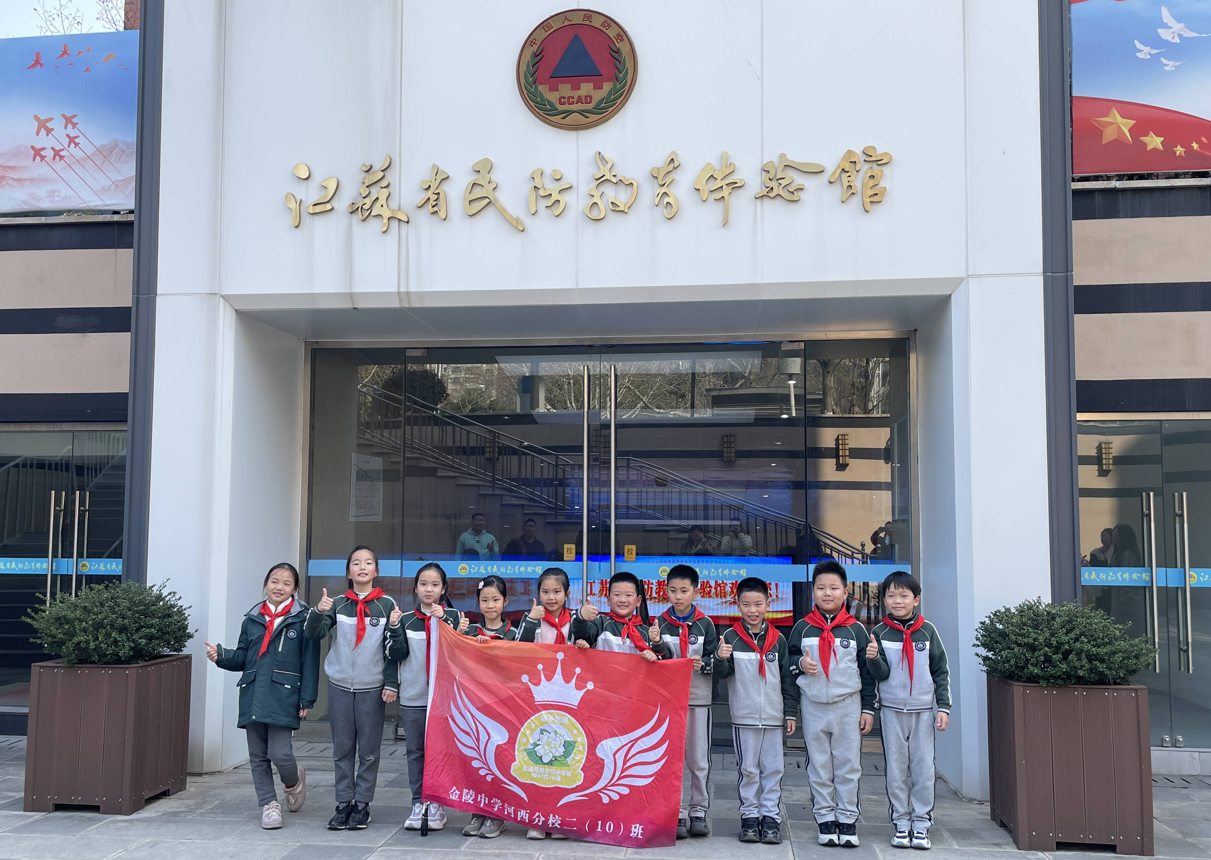 江苏省民防教育体验馆是全国中小学生研学实践教育基地、国家防震减灾科普教育基地,拥有丰富的民防科普资源和贴合低年级学生认知特点的沉浸式体验项目。为确保研学活动安全、有序、高效,二10班提前做好周密筹备:班主任与场馆工作人员精准对接参观路线、体验项目及讲解安排;开展专项动员班会,明确活动规则、安全要求,普及民防基础小知识;合理划分小组,安排班主任、副班主任及家长志愿者全程随行,备好应急药品、班级旗帜等物资,为活动保驾护航。