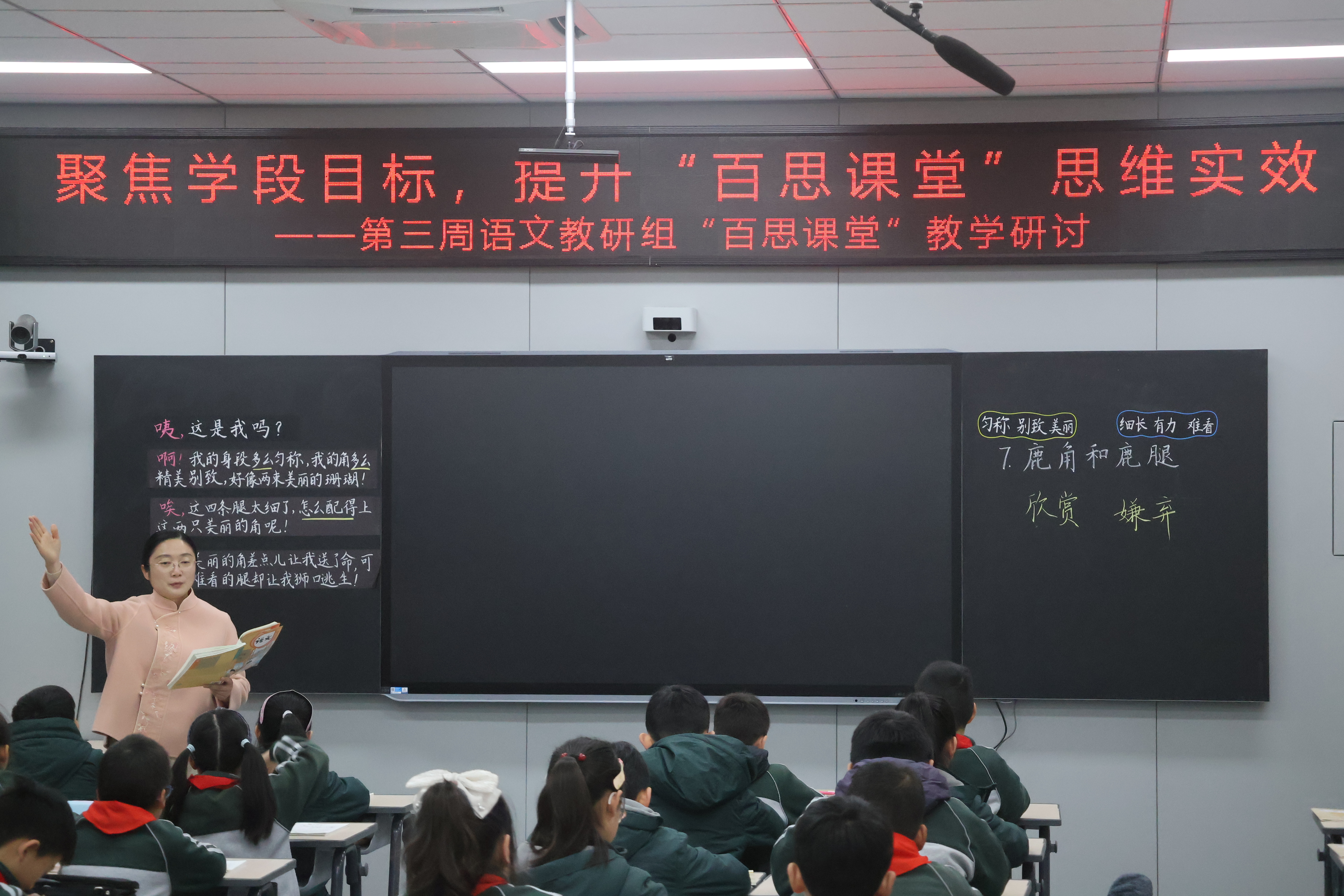 活动伊始,两节高质量熄屏示范课精彩呈现。三年级邱明莉老师执教《鹿角和鹿腿》,五年级孙静老师执教《红楼春趣》。两位老师全程不使用多媒体屏幕,以课本为核心,以板书为抓手,紧扣学段思维生长点设计核心问题,充分引导学生自主探究、思辨交流。课堂上学生饱满的学习状态、流畅的表达展现,以及精巧的板书设计,获得在场教师一致认可。听课过程中,全体教师对照“百思课堂”课堂观察评价表,聚焦学生学习与思维发展,开展精准观课记录。
