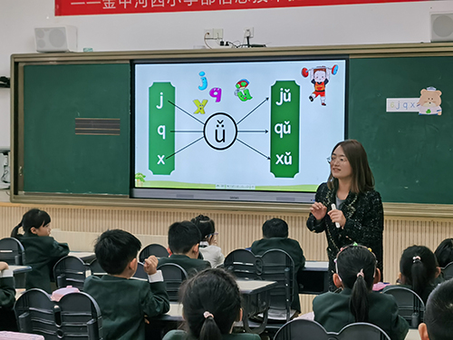 王悦老师执教一年级第二单元《jqx》第一课时,以一个熊宝宝的故事串联课程,环节过渡语能够激发起学生兴趣。同时利用手指操、动手拼字母、摘苹果的活动,调动学生兴趣,让枯燥无味的拼音学生更加生动活泼。值得一提的是,王老师针对本课中的jqx和ü相拼的难点突破有方法,用各种形式让每一位孩子能够参与到课堂中来。